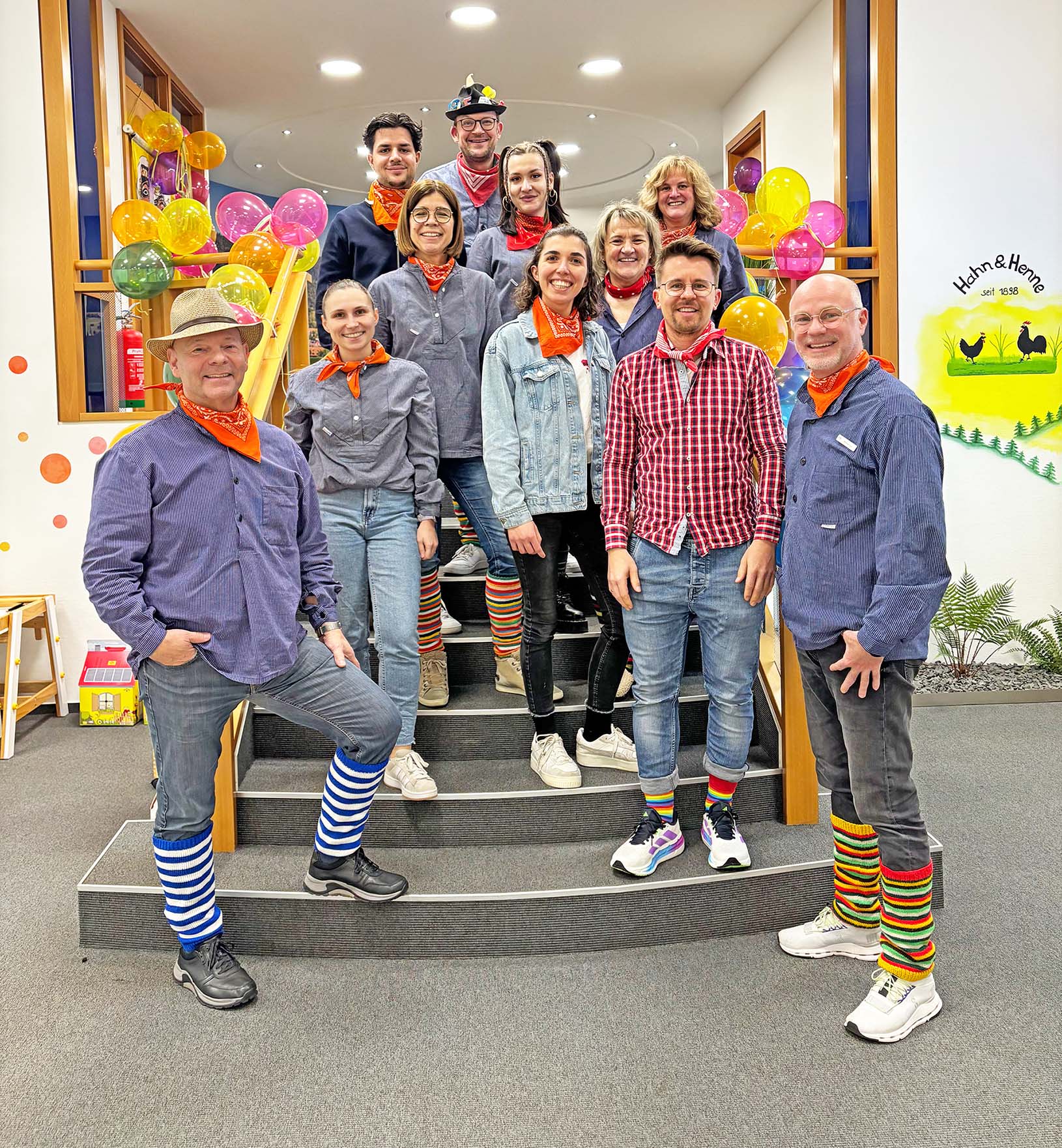 Blaues Burehemd, rotes Halstuch, Narrenkappe, bunte Ringelsocken: bodenständig geht es zur Fasend 2026 bei der Volksbank-Geschäftsstelle zu.