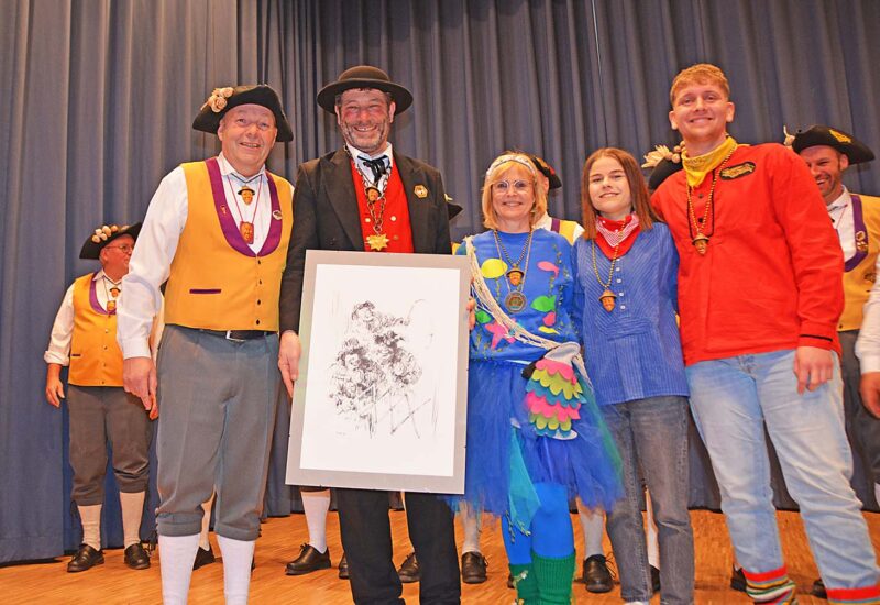 Mit einem Stich der Zeller Traditionsfiguren aus der Feder von Künstler Armin Göhringer wurden drei Aktive geehrt. Caterina Lechner wirkt seit 25 Jahren bei der Fasendgemeinschaft Insel mit. Stefan Huber ist seit 40 Jahren Dörfle-Bur und leitet seit 20 Jahren als Dörfle-Bürgermeister die Geschicke der Gemeinschaft. Von der Fasendgemeinschaft Städtle erhält Britta Kornmayer die Göhringer-Grafik.