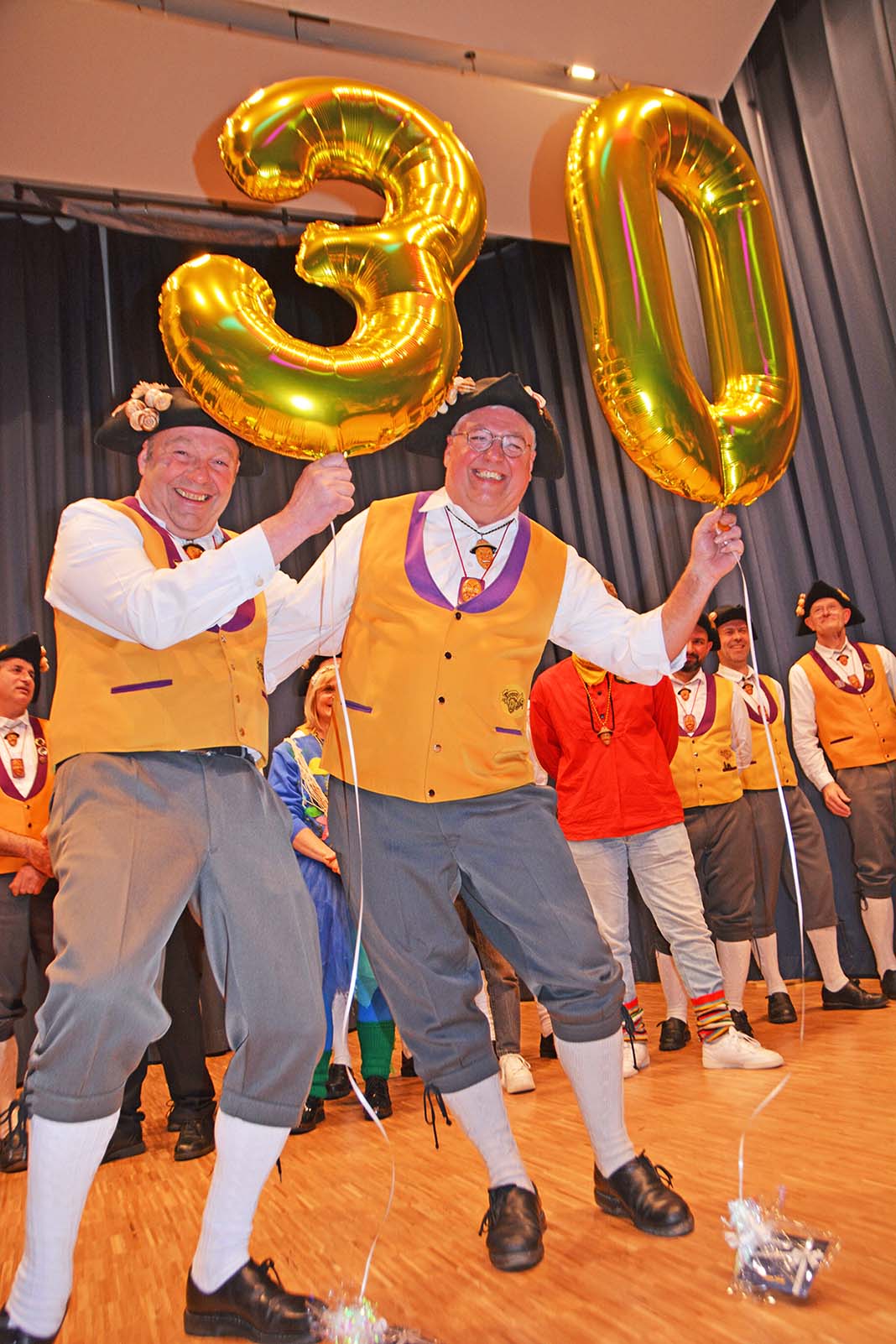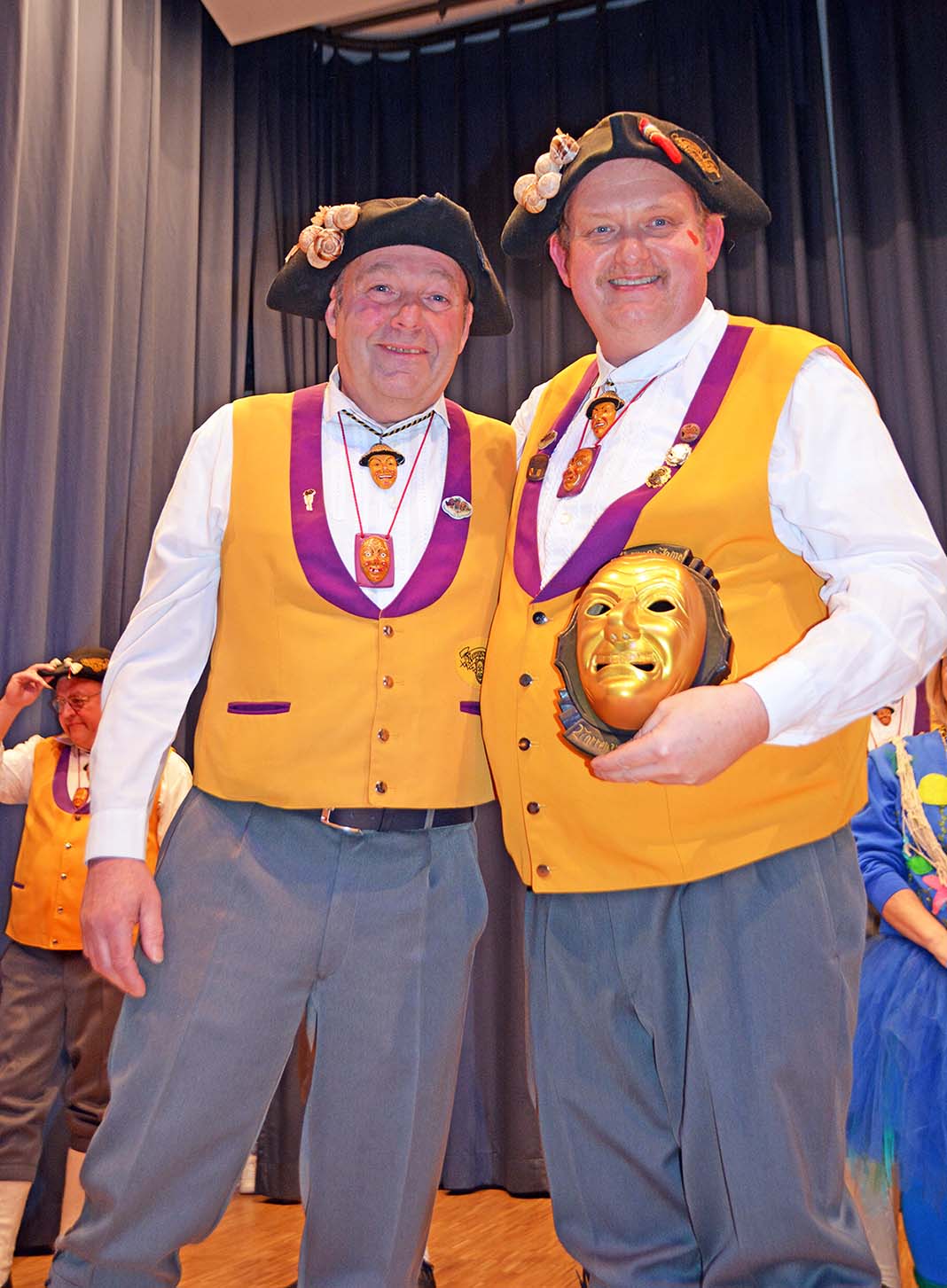 Die beiden Narrenräte Torsten Heizmann und Dietmar Fischer gehören seit 10 Jahren dem Gremium an und dürfen künftig den großen Narrendatscher mit sich tragen.