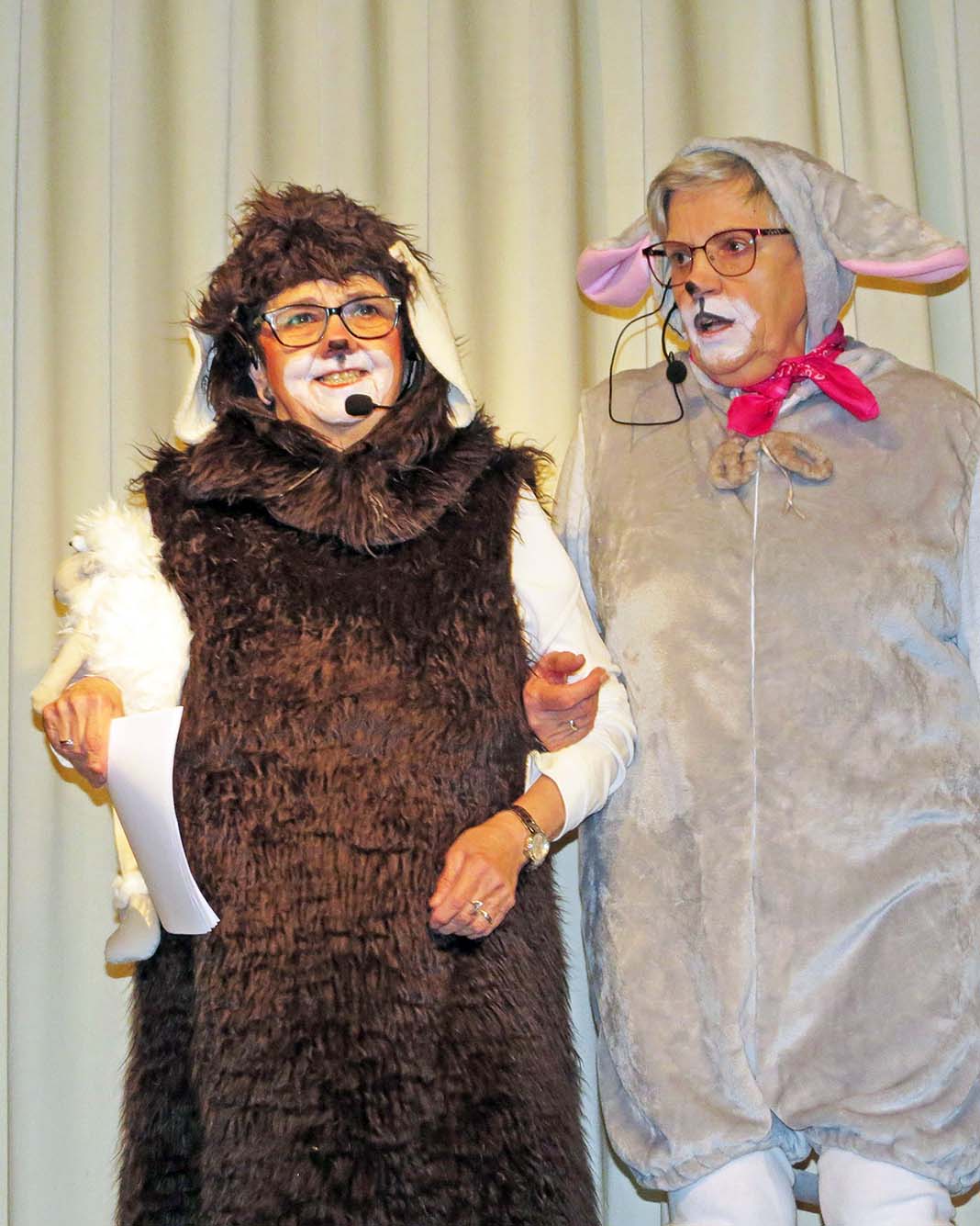 Dann stellten sich die Moderatorinnen Brigitte Metzler und Melitta Himmelsbach als Schafe vor. Sie wohnen auf der Empore in der Kirche bei den Krippenfiguren und erfahren so alles, was in der Kirche los ist. Die Kirche wurde gründlich geputzt und ist jetzt so sauber, dass sie nichts mehr zu fressen finden. Was machen die Schafe dann? Sie kriegen sich in die Wolle.