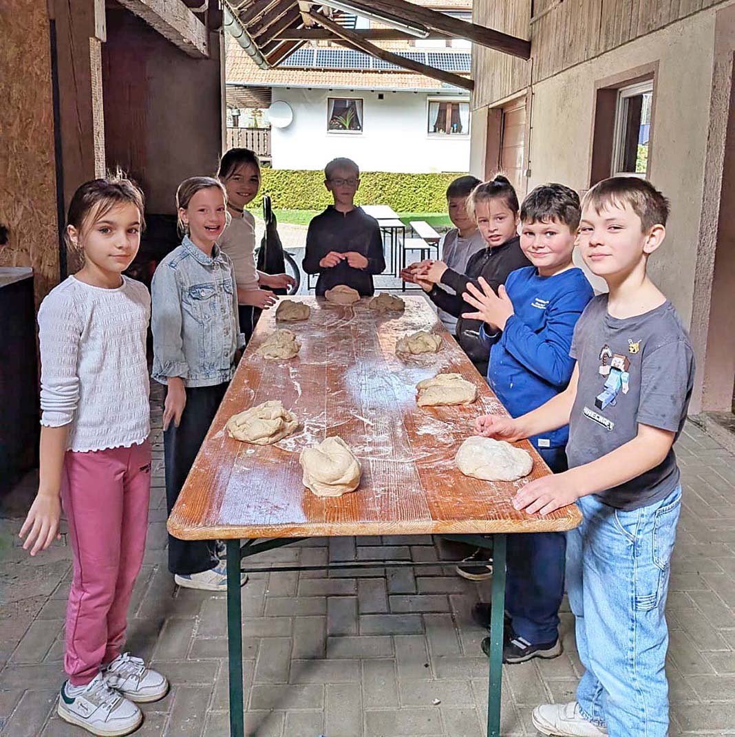 Mit viel Freude und Eifer mahlten die Kinder Getreidekörner, kneteten Teig und formten eigene Brotlaibe. Während das Brot im Ofen backte, beschäftigten sie sich mit der Bedeutung von Brot im Alltag und im Glauben.