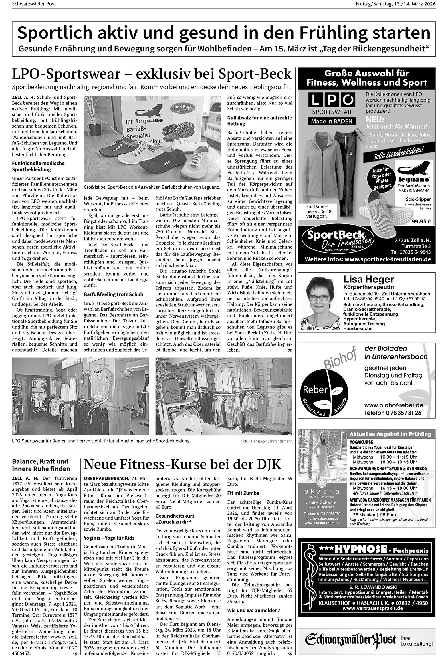 Zell am Harmersbach | 13.03.2026 Sportlich aktiv und gesund in den Frühling starten Foto:LPO-Sportswear für Damen und Herren steht für funktionelle, modische Sportbekleidung. Foto: Hanspeter Schwendemann von Schwarzwälder PostGesunde Ernährung und Bewegung sorgen für Wohlbefinden – Am 15. März ist „Tag der Rückengesundheit“ Foto: SP Foto: SPDas könnte Sie auch interessieren:FORUM älterwerden Biberach: „Der Frühling…SVO empfängt den SC OrschweierFoto: Rolf BraunManuel Nepple ist neuer Kommandant der Feuerwehr