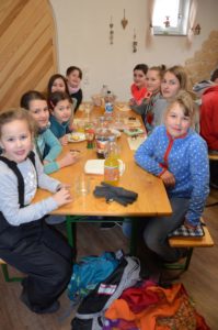Am Gastehof angekommen freuen sie sich auf die Pause. Familie Schwendenmann serviert heiße Wienerle mit Baguette. Das Traditionsgericht, erzählen die Kinder. Danach Obst- und Zupfkuchen und Donuts mit Schokoladenüberzug. Vorher dürfen die Peterschüler aber auch hier ihren frühlings-bringenden Spruch vortragen. Sie verjagen damit kleine Krabbeltiere aus dem Haus, die vielleicht zu Beginn der kalten Jahreszeit dort Schutz gesucht haben und wecken die Freude auf Frühling, blühende Blumen und Wärme.