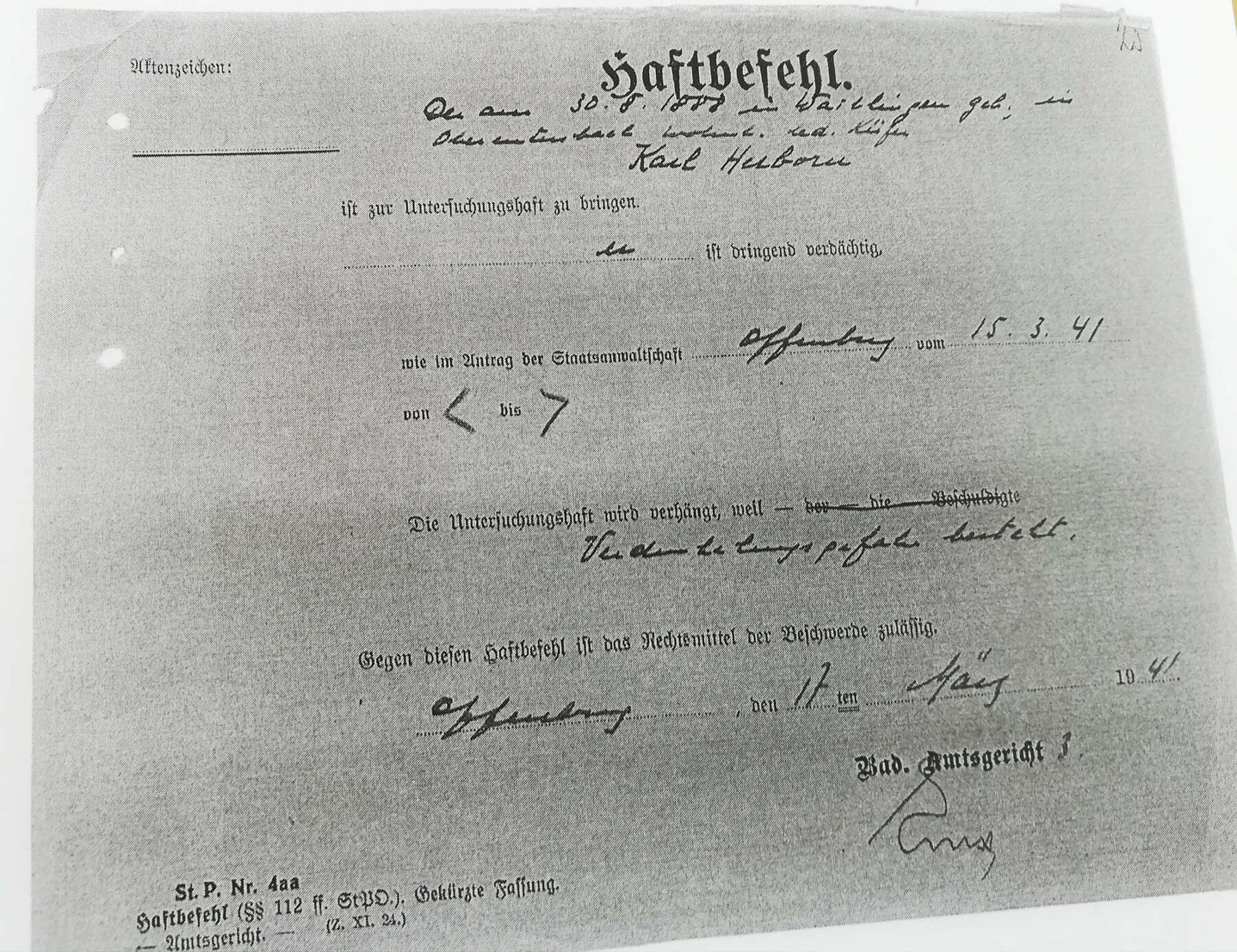 Am 11. März 1941 beantragt die Gestapo bei der Oberstaatsanwaltschaft Offenburg einen Haftbefehl, damit die bestehende Schutzhaft aufgehoben werden kann. Dieser Haftbefehl wird am 17. März ausgestellt. Es bestehe Verdunkelungsgefahr und dass der Beschuldigte Zeugen zu falschen Aussagen verleite, wenn er sich auf freiem Fuß befinde. Außerdem seien die Erhebungen noch bei Weitem nicht abgeschlossen.