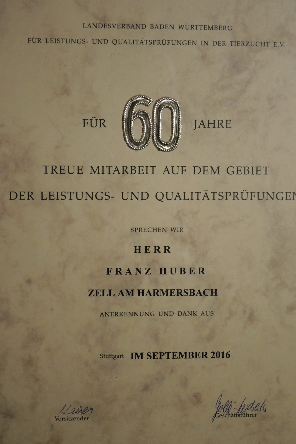 In den Tagen und Wochen vor Weihnachten sagen Unternehmen in der Region langjährigen Mitarbeitern traditionell »Danke« für ihre Treue und für ihre Leistungen. Vielfach können 10-, 20-, 25- manchmal 30- und 40-jährige, ganz selten 50-jährige Betriebszugehörigkeit gewürdigt werden. Ein ganz besonderes Ereignis ist sicherlich diese Ehrung: Franz Huber aus Unterentersbach erhielt in der Stadthalle Rottenburg vom Landesverband für Leistungs- und Qualitätsprüfungen in der Tierzucht e.V. die Urkunde für 60 Jahre treue Mitarbeit auf dem Gebiet der Leistungs- und Qualitätsprüfungen.