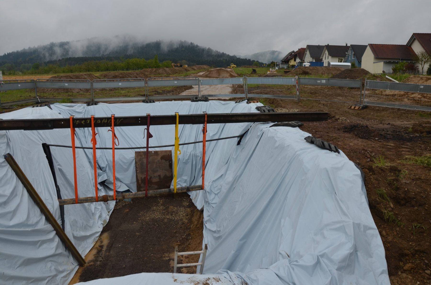 Unterhalb des Neubaugebiets verwehrt eine Grube die Nutzung des östlichen Radwegs. Sie ist für ein besonderes Verfahren ausgehoben: Die Firma »Terra Bohr und Press« aus Iggingen wird kommende Woche sechs Meter lange, im Durchmesser 40 Zentimeter starke Stahlrohre unter der Kreisstraße hindurchpressen. Mit einer Schweißnaht werden die Rohrstücke verbunden.