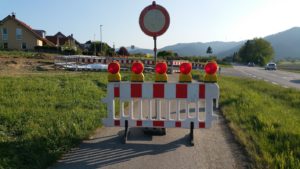 Die Bauarbeiten haben den östlich der Kreisstraße liegenden Radweg und die schmale Straße oberhalb des Neubaugebiets unbefahrbar gemacht. »Die obere Zufahrtsstraße in die Wohnstraße wird breiter«, erklärt Ulrich Harder, örtlicher Bauleiter vom Planungsbüro »Wald und Corbe«. Damit diese Straße entstehen kann, musste die schmale Straße teils abgebrochen werden. Nach der Kalkung wird auch die Zufahrtsstraße geschottert. Liegt der Schotter, wird die Straße vom »Hillig« zum Kreuz wieder geöffnet.