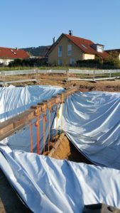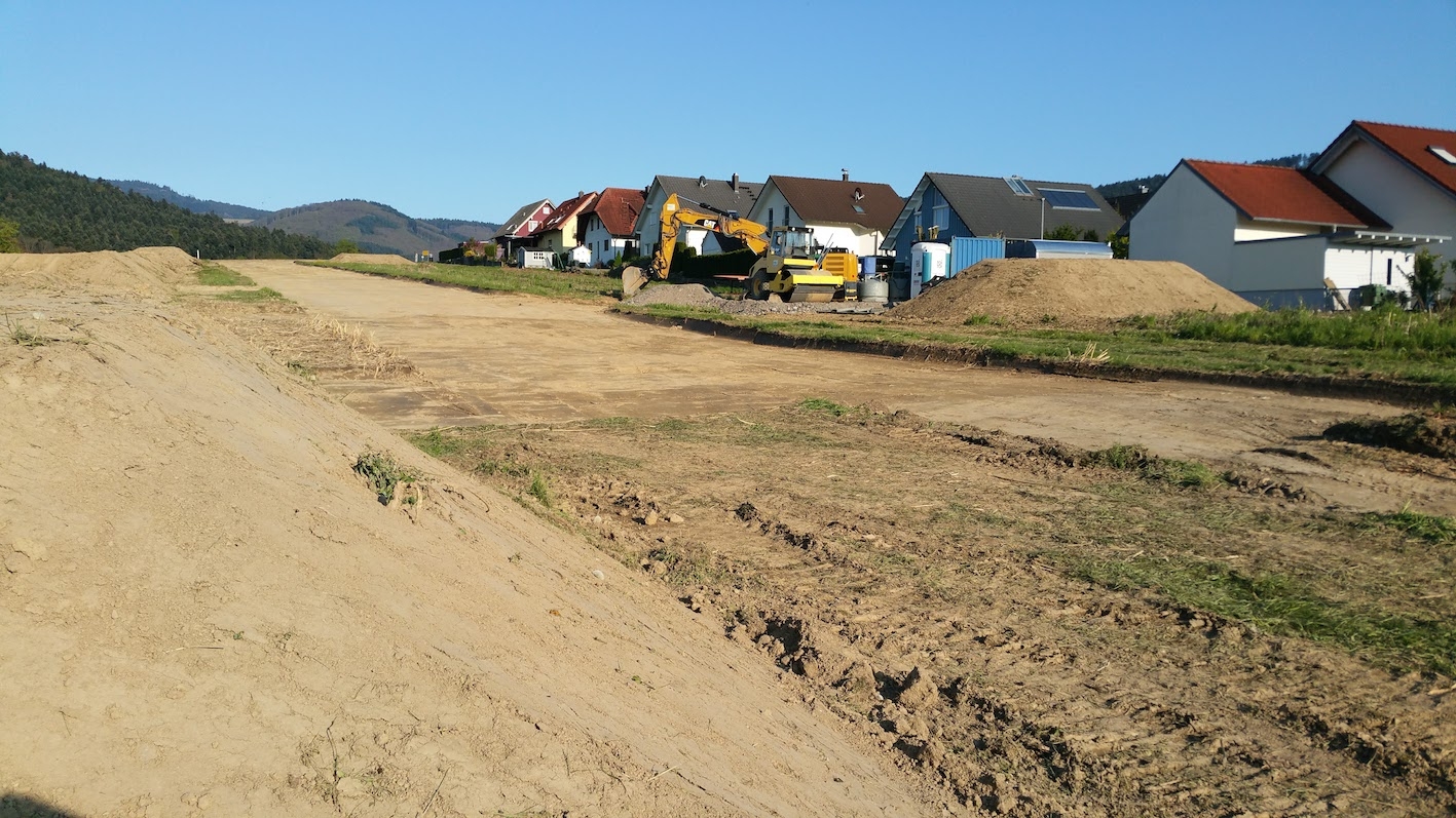 Ausgehoben hat Frank Griesbaum – nach abtragen des Oberbodens – lehmiges Material bis zur Unterkante der Frostschutzschicht. In der Fachsprache »ausgekoffert bis zur Koffersohle«. 300 Kubik Erde werden aktuell abgefahren. Bis das Gebiet erschlossen ist werden es an die 4.000 Kubik sein.