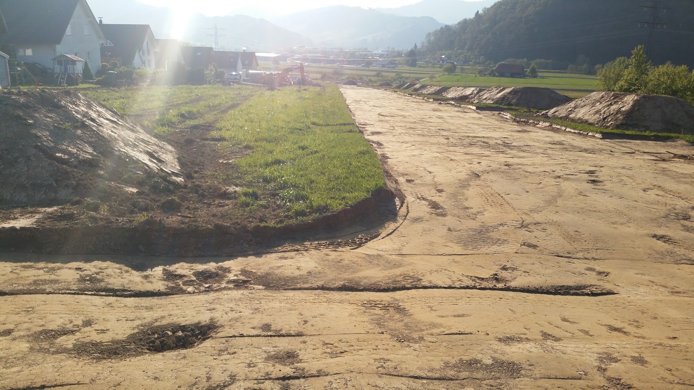 Das »Planum« ist schon seit einer Woche deutlich zu sehen. Damit ist die technisch bearbeitete Fläche gemeint, auf der die Straße aufgebaut wird. Kommende Woche wird das freigelegte Erdreich gekalkt.