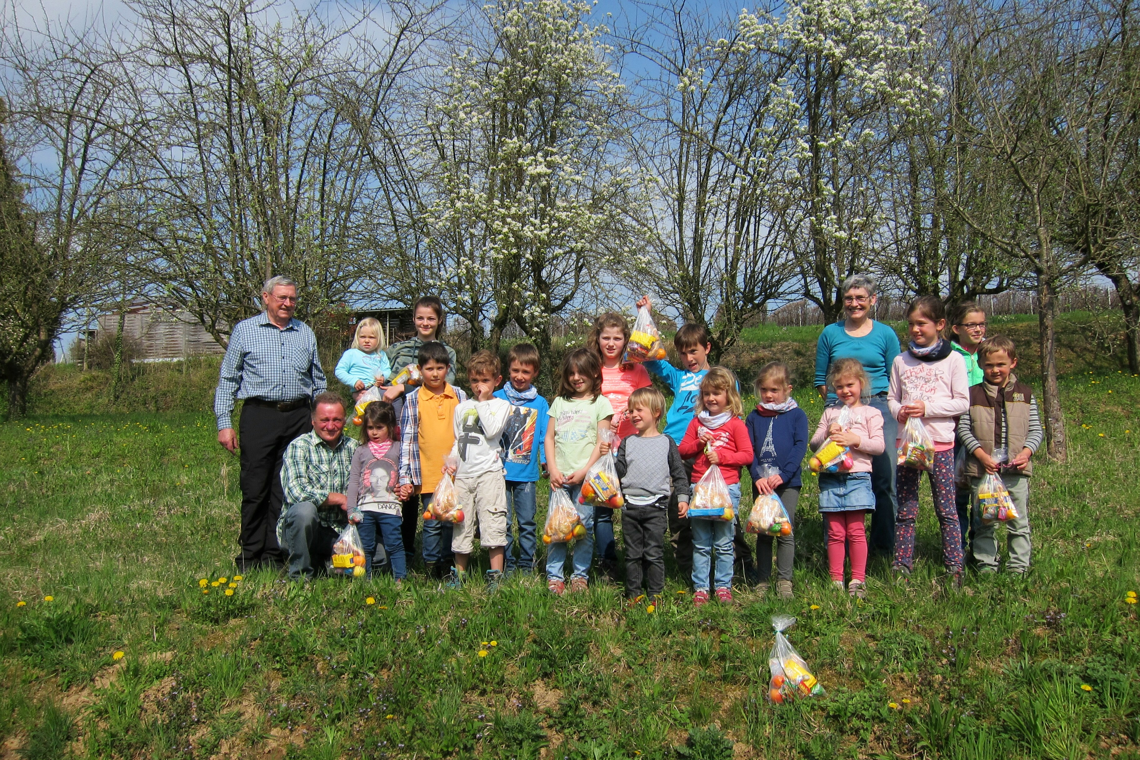 Ein Spielplatz am Weg war für die Wandererkinder eine willkommene Unterbrechung, bis man weiter am Bach entlang mit Blick auf die Weinberge zur Riedmühle wanderte. Hier ließ sich der Osterhase nicht lange bitten, hatte er doch zum Verstecken eine schöne Wiese mit blühenden Obstbäumen entdeckt. Rasch waren alle Nester gefunden und stolz stellten sich die Kinder und »Hasen« zu einem Gruppenfoto auf.