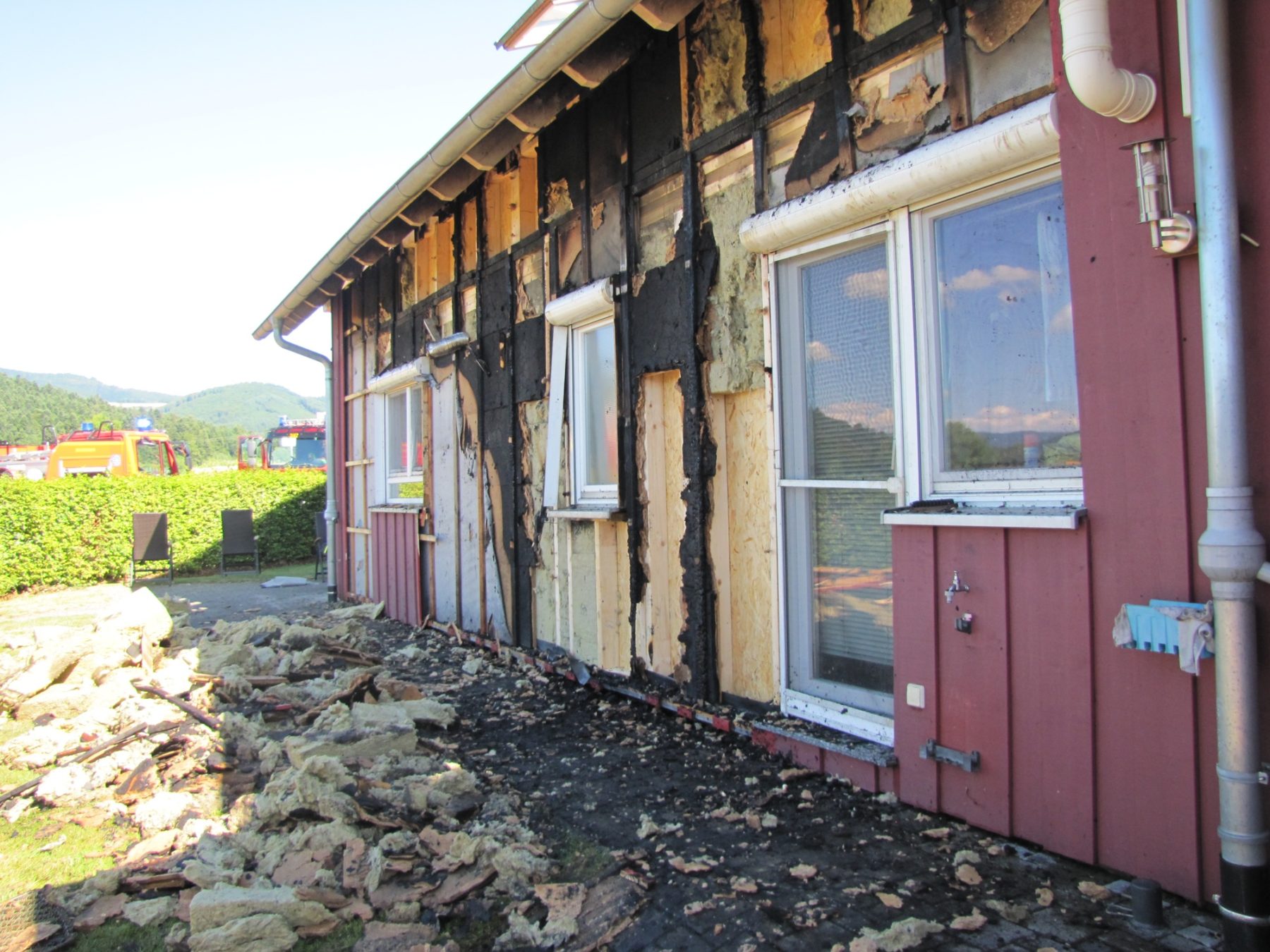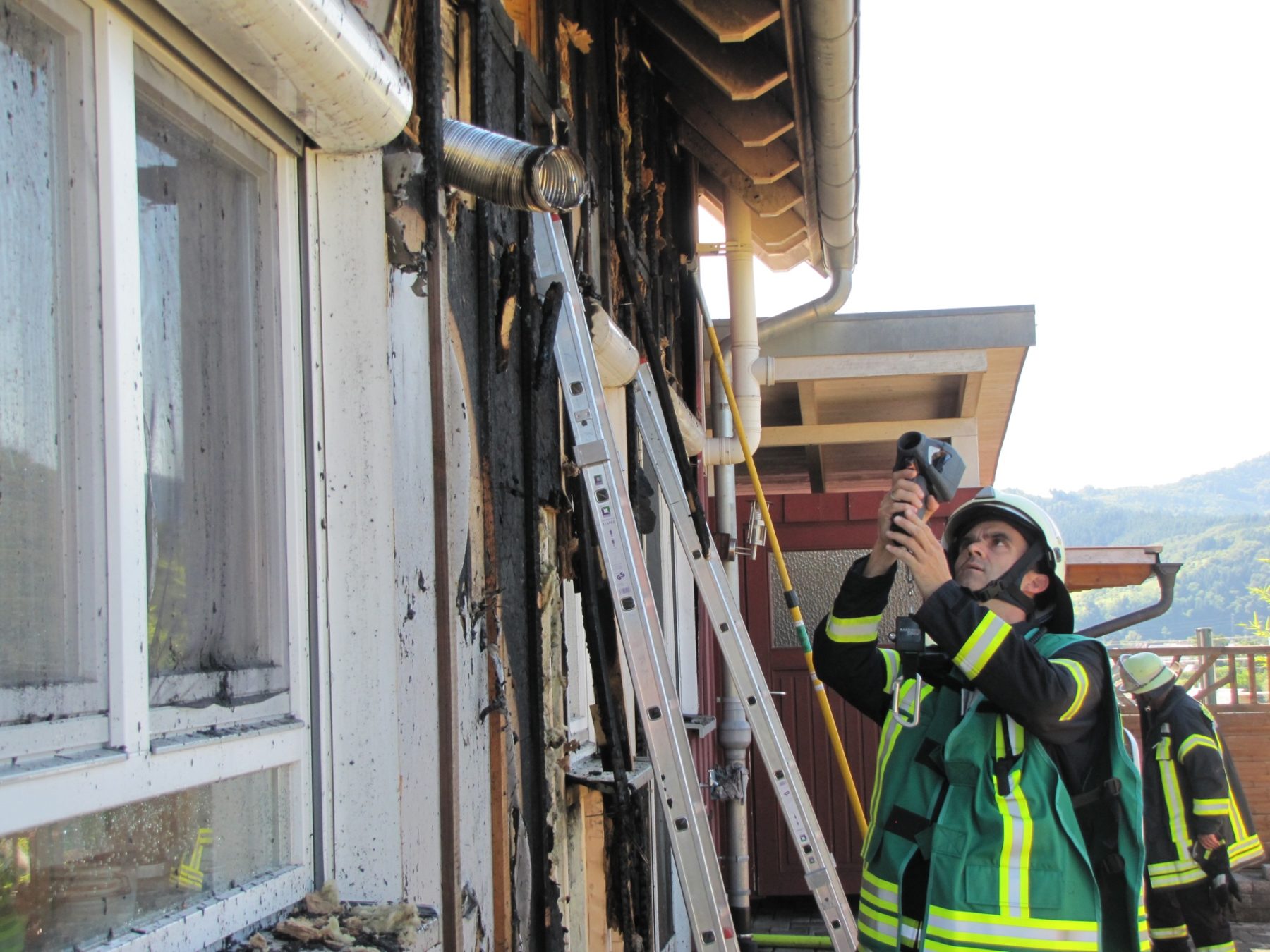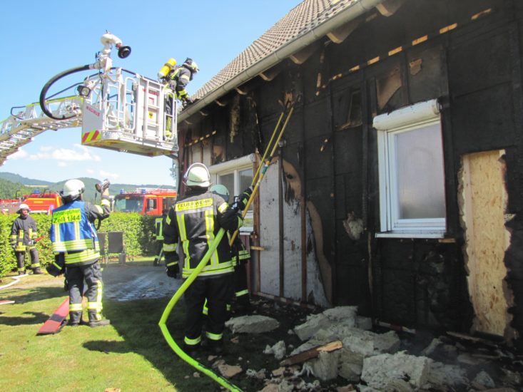 Zwischenzeitlich wurden ein Teil der Holzverschalung und der Isolierung von den Feuerwehreinsatzkräften entfernt. So konnte gezielt das Löschwasser eingesetzt werden. Parallel dazu mussten die Atemschutzträger sowohl im Innen- als auch im Außenbereich verschiedene Einsätze leisten. Auch das Belüftungsgerät wurde eingesetzt, um den Rauch aus dem Wohnbereich zu entfernen.