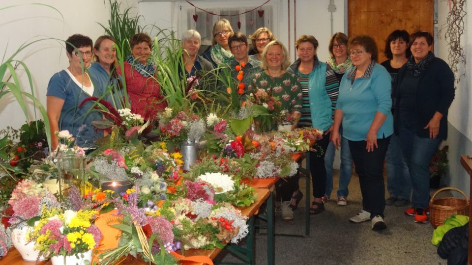 Dann hieß es für alle Teilnehmerinnen, jetzt gestalten wir. Aus der Vielfalt der vorhandenen Blumen suchte sich jeder etwas aus und so entstanden im Laufe des Abends eine Vielfalt von unterschiedlichen Herbst­kränzen, Blumensträußen, Tischschmuck und Gestecken für den Friedhof. Man hörte nicht auf, bis auch die letzten Blumen in irgendeiner Weise eine neue Form gefunden hatten.