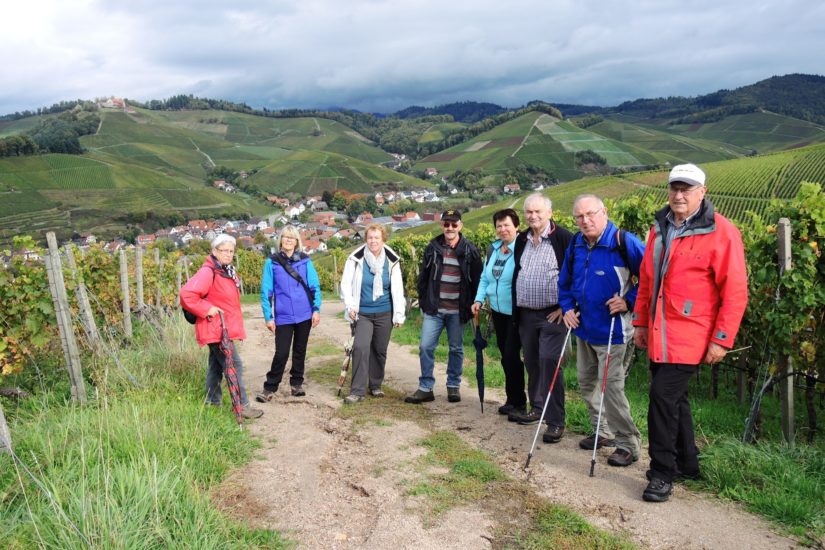 Sogar der stets überfüllte Wanderparkplatz bei der »Großen Eiche« zwischen Rammersweier und Durbach bot noch genügend Platz. Durch Kastanienwälder führte der Weg zur Staufenbergklinik, die von einem ganzen Skulpturenpark aus verschiedenen Materialien umgeben ist. Kreuz und quer wanderte man anschließend durch die Weinberge von Durbach und gewann allmählich an Höhe, bis man eine herrliche Aussicht auf die Weinbaugemeinde mit dem Schloss Staufenberg hatte. Viele Rebflächen waren noch nicht abgeerntet, und boten mit buntem Laub und reifen Trauben ein malerisches Herbstbild, was natürlich auch zu etwas Mundraub verführte. Beim Blick zurück über den Rheingraben zu den Vogesen war deutlich das Straßburger Münster zu erkennen. Einzelne Sonnenstrahlen zauberten interessante Lichteffekte. Über die Sendelsbacher Höhe führte der Weg hinunter in den Vollmersbach und wieder hinauf zur Kreuzebene. Nach einem Besuch der Schönstattkapelle mitten in den Rebbergen wandte man sich der Rammersweierer Seite zu. Auf dem »Offenburger Weinwanderweg« erreichte man im Ortskern die urige Strauße zum »Mattebur«, wo man sich Leckeres aus den Weinbergen, »vun de Wutz un vum Acker« schmecken ließ. Ein halbstündiger Verdauungsspaziergang führte abschließend zurück zum Ausgangspunkt, wo den Wanderführern Anneliese und Franz Huber ganz herzlich für diese schön ausgesuchte, gesellige Weinwanderung gedankt wurde.