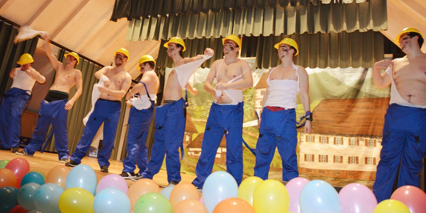 Auch optisch zogen die Entersbacher Narren beim Gemeinschaftsabend wieder alle Register. Im Blaumann wirbelte der Muskel-Männer-Bautrupp über die Bühne und brachte vor allem das weibliche Publikum zum Jubeln. Dabei flogen nicht nur Schweißtropfen sondern am Ende auch noch die zerrissenen Feinripp-Unterhemden ins Publikum.