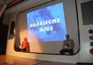 »Närrische Njus«, so recht nach dem Geschmack des Narrenvolks, gaben die beiden Fernsehmoderatoren bekannt. Gleich zu Beginn klärten sie auf, dass der Schnitzerbriefkasten beim DGH der Narrengemeinschaft dient. Werbehefte, Müll und besonders Krankmeldungen von Kindern des Kindergartens hätten darin nichts zu suchen. So manche ihrer Nachrichten konnten die Fernsehsprecher mit den passenden Bildern hinterlegen. »Don’t sleep and drive« rieten sie Uwe Brosamer, der beim Junggesellenausflug das Aussteigen aus dem ICE in Köln verschlafen hatte. Verplant war auch Martin Scherers XXL-Smoker, der nach dem Zusammenbauen zu groß oder das Garagentor zu klein war. Derweil sorgte Ronny Kuhnts Freundin Jerka mit ihrem Grillfeuer sogar für einen Feuerwehreinsatz. Und noch etwas gab es klarzustellen: die Zeller Narrenzunft habe in diesem Jahr kein Sammlerabzeichen, weil der Welschkornnarro in China falsch interpretiert und mit einer Eckwaldhexe verwechselt wurde.
