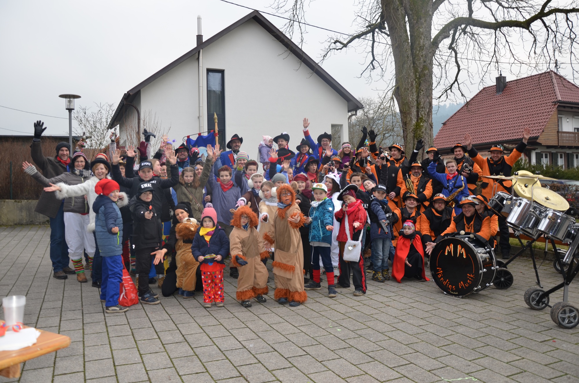 Weitere kleine und große Narren trudelten ein. Stärkten sich am Büffet beim Dorfgemeinschaftshaus. Die Mändigs Musik spielte zum Auftakt. Die Heimatzeitung hielt die Schar auf einem Foto fest. Dann konnte es losgehen. Die Narren begannen ihren »Dienst« und riefen die Fasend aus.