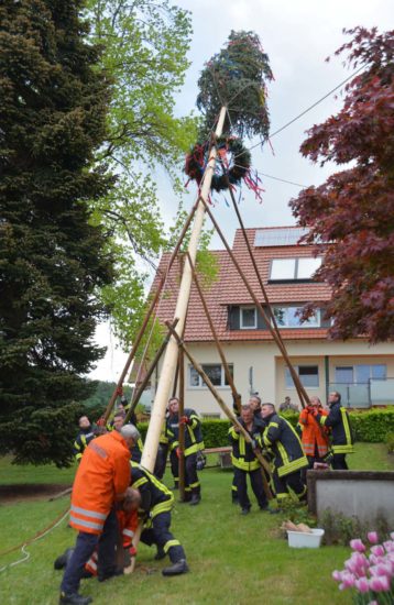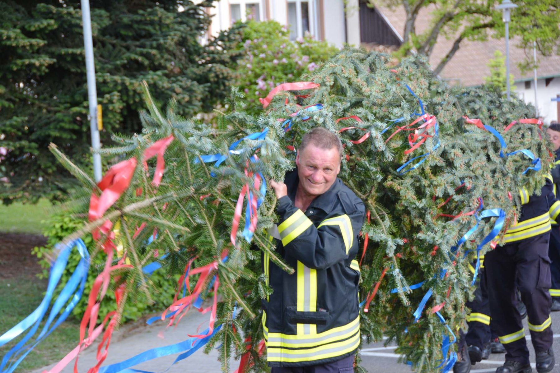 Foto: Hanspeter Schwendemann»Nachmittags wollten wir wegen des böigen Windes das Maibaumstellen fast noch absagen«, berichtete Ortsvorsteherin Andrea Kuhn. Der Wind hatte zum Glück am Abend schon deutlich nachgelassen, so dass die Männer der Unterentersbacher Feuerwehr den 17-Meter-Maien nach alter Tradition mit Muskelkraft aufrichten konnten.