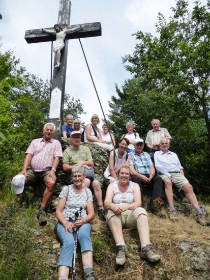 Von der Passhöhe am Landwassereck ging es rechts weg über den Huberweg sanft in die Höhe bis zur Abzweigung zum Pfauenfelsen, den man nach einem kurzen, knackigen Anstieg erreichte. Unter dem mächtigen Wegkreuz ließ man sich zu einer kurzen Rast nieder und bewunderte die prächtige Aussicht ins Elztal. Schwarze Wolken und Donnergrollen über dem Prechtal machten der Wandergruppe jedoch bald Beine. Durch das Naturschutzgebiet mit seinen mächtigen Buchen wanderte man auf schönen Pfaden der Prechtaler Schanze entgegen. Sie gehörte einst zu den zahlreichen Verteidigungsschanzen gegen Frankreich, Reste sind heute noch zu erkennen. Auf diesem Höhenweg befindet man sich genau in der Mitte des Westwegs, jeweils 143 Kilometer sind es nach Pforzheim wie nach Basel. Der Weiterweg führte vorbei an einem der sechs mächtigen Windräder, dessen Inneres bei vom E-Werk geführten Wanderungen besichtigt werden kann, durch den Wald hinunter zum Fahrweg. Auf dem Landwassereck wurde rasch eingekehrt, denn das Endspiel der WM lockte. Mit einem Dankeschön an die Tourenführerin machte man sich auf den Heimweg.