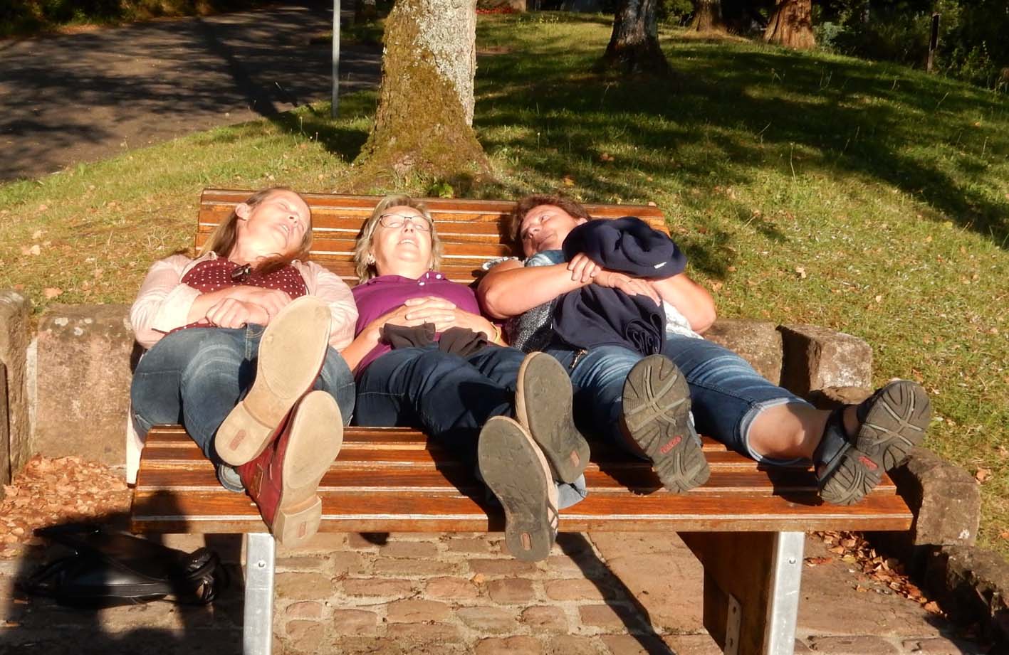Beim Treffpunkt am Sportplatz in Zell-Unterentersbach trafen sich bei sonnigem, aber nicht zu heißem Wetter eine große Zahl von LandFrauen. Nach einer kurzen Begrüßung durch die Vorsitzende Petra Isenmann führte der Weg hinauf zur Gehrmatt. Nachdem man die Himmelsliege ausgiebig ausprobiert hatte, konnte an der Grillstelle Hochprozentiges probiert werden. In der schönen Abendsonne saßen alle gemütlich auf den verschiedenen Sitzmöglichkeiten und ließen sich von der Sonne verwöhnen. Dann ging es weiter durch den Wald zur Europabrücke. Ein Erinnerungsbild wurde geknipst. Danach wurden die Felder des Demeterbauernhofs Reber angesehen. Alle waren erstaunt, dass hier die Pflanzen trotz der vielen Wärme und des wenigen Regens in der letzten Zeit so gut wachsen. Durch das Oberdorf gelangte die Gruppe dann schließlich zur Vesperstube »Schwarz-Webers«. Ausgiebig wurden die Gärten und Blumen an den Häusern begutachtet. Beim »Schwarz-Weber« hatten sich noch einige LandFrauen eingefunden, die nicht mit gelaufen waren. Alle fanden Platz unter der Pergola. Bei gutem Essen und Trinken saßen alle noch lange zusammen. Ein Dank galt den Entersbacher LandFrauen für die Ausrichtung des diesjährigen Treffens. Ein weiterer Dank ging an Erich Schwarz, dass er für die LandFrauen an diesem Tag seinen Biergarten geöffnet hatte.