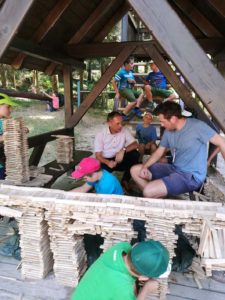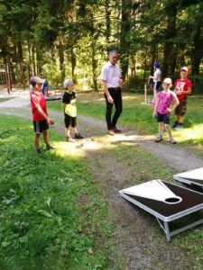 Dann war auch schon das Mittagessen angesagt. Geschnetzeltes mit Spätzle und Karotten standen auf der Speisekarte. Mit den Spätzle wurde es knapp, während Karotten noch reichlich übrig blieben. Der Nachmittag verlief dann mit Spielen im Wald und an der Wassertretstelle. So blieb dabei auch die Hitze erträglich.