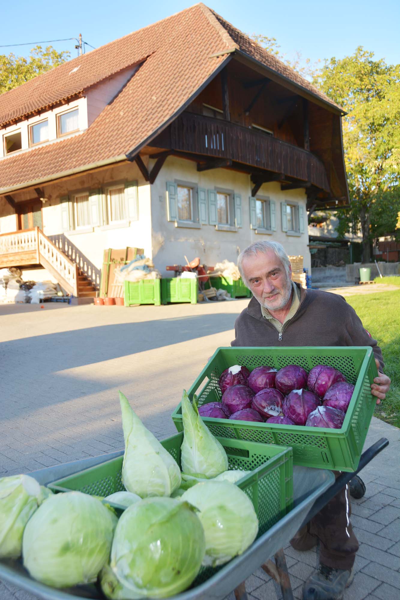 Zufrieden ist Landwirt Armin Reber mit den Kohlsorten. Weißkraut, Spitzkraut und Rotkraut haben schöne Köpfe gebildet und stehen nun erntefrisch zum Verkauf bereit. Gewachsen ist das Kraut auf dem Acker im Gewann Roth oberhalb des Dorfs Richtung Oberentersbach. Die Kohlsorten konnten früh gepflanzt werden und waren schon gut herangewachsen, so dass sie die lange Trockenheit dann gut überstehen konnten.