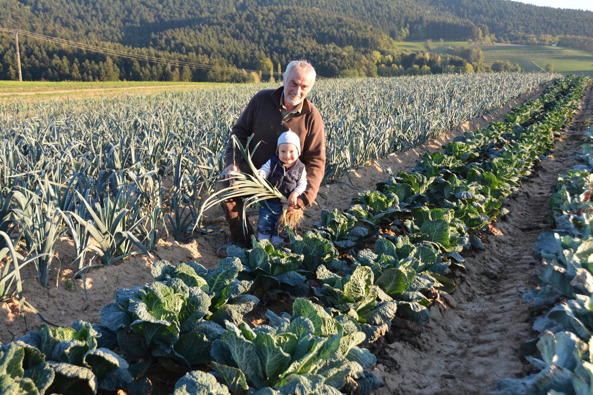 »Auch das Wintergemüse entwickelt sich gut«, erklärt Landwirt Armin Reber auf dem Acker im Bereich Hillig. Die Lauchstangen sind fast schon so groß wie sein 14 Monate alter Enkel Simon. Auf dem Acker wachsen neben dem Lauch auch noch Weißkraut, Wirsing und Feldsalat. Das Gemüse kommt in den nächsten Wochen und Monaten ebenfalls erntefrisch auf den Markt.