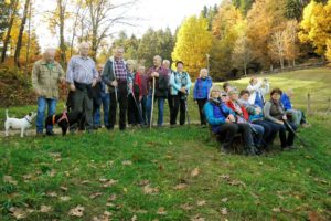 Vom Ausgangspunkt am Mühlenstüble führte der Weg zunächst durch den Ortsteil Allmend. Bei der Brücke bog man ab und wanderte sanft ansteigend durch die Herbstwälder im Michelbach. Dieser Weg und die versteckt im Wald gelegene, ansprechende Freizeitanlage war vielen aus der Wandergruppe nicht bekannt. Man lernt eben in der Heimat auch immer wieder Neues kennen. Am Jüdischen Friedhof angekommen, fanden die Hinweistafeln zu der Geschichte des Friedhofs großes Interesse bei den Teilnehmern. Nach der Zerstörung in der NS-Zeit und Wiederaufbau nach dem Krieg wurde hier im Jahr 1977 mit Meta Beilstein, der Tochter des ersten Verwalters der Lungenheilstätte Rothschild, die letzte Person auf eigenen Wunsch bestattet.