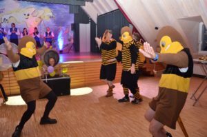 Nach ihnen surrte ein Bienenschwarm in die Halle. Über die Lautsprecher ertönte das bekannte Kinderlied »Und diese Biene die wir meinen ist …« nein nicht Biene Maja, sonder »Bienenmartin«. Die Hommage der sieben Gemeinschaftsbosse für ihren Kollegen sorgte für Heiterkeit im Saal. »Du hesch ä richtig gutes Volk«, stellten sie dazu fest.