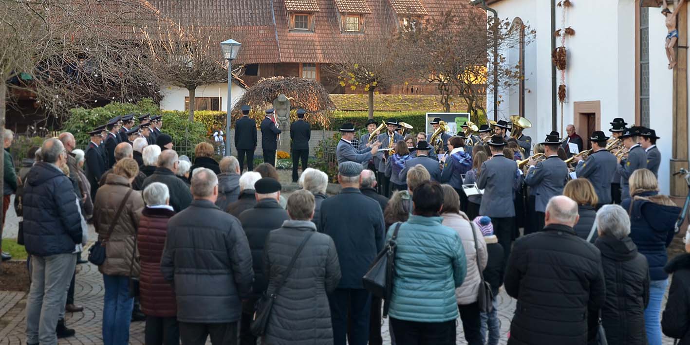Üben wir uns in Frieden. Dann können die Musikerinnen und Musiker auch im Jahre 100 ihres Vereines in Frieden leben und eine Messe musikalisch begleiten, in denen ihrer Kolleginnen und Kollegen gedacht wird, die hoffentlich nach einem erfüllten Leben friedlich eingeschlafen sind. Und die Feuerwehr wird den Kranz niederlegen für alle Menschen, die in den dann vergangenen 50 Jahren sich in Frieden übten und lebten. Und die zwei Tafeln bleiben zwei.