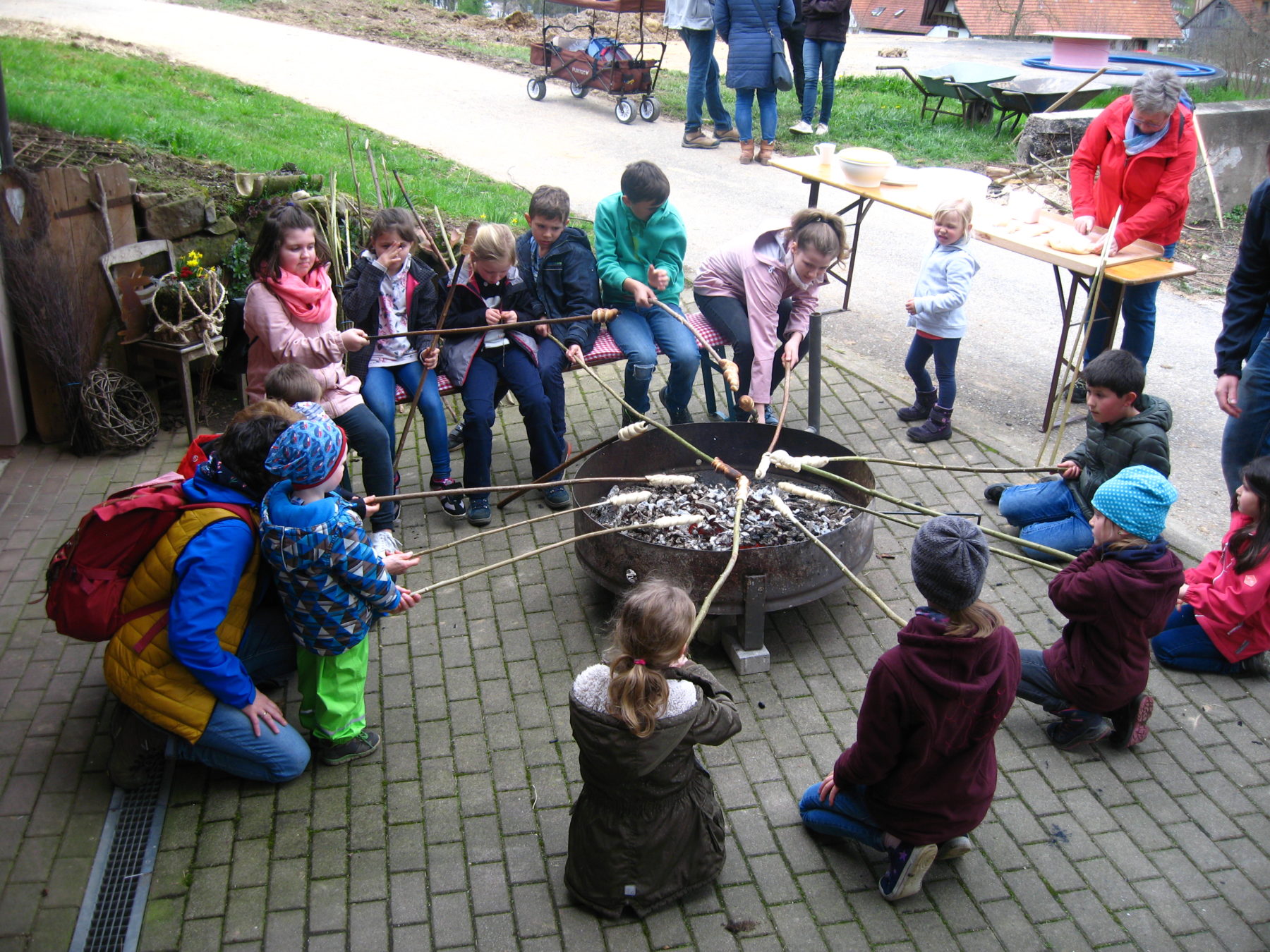 Nur kurz genoss man die herrliche Aussicht, denn die Kinderschar stürmte voraus durch den verwunschenen Pfad im Zauberwald mit seinen moosbewachsenen Bäumen. Am »Hexenhäusle« hatte der Osterhase zur allgemeinen Freude wohl schon einige Süßigkeiten verloren, die begeistert aufgesammelt wurden. Bei einem Aufenthalt in der Erholungsanlage Herrenholz wurden die Erwachsenen mit einem Schnäpsle von den Tourenführern für den Weiterweg gestärkt. Dieser führte nach Hippersbach, mit schönsten Ausblicken ins Harmersbachtal und auf die ersten blühenden Obstbäume. Auf einem nahen Bauernhof war schon eine Feuerschale zum Stockbrot backen gerichtet, die sofort von kleinen Bäckern umringt wurde – selbstgemacht schmeckt es eben am besten. Nach erfolgreicher Hasenjagd präsentierten alle Kinder stolz ihre lecker gefüllten Ostertüten. Der vergnügliche Aufenthalt wurde vom einsetzenden Regen beendet, und so wanderte man auf dem Radweg rasch zum Ausgangspunkt zurück.