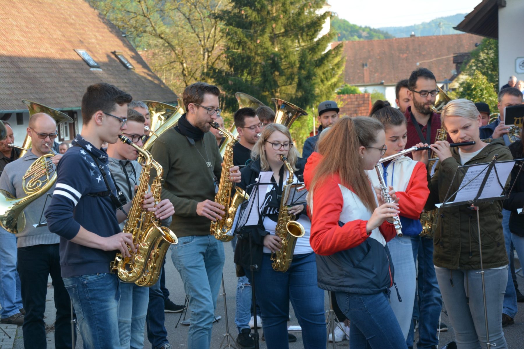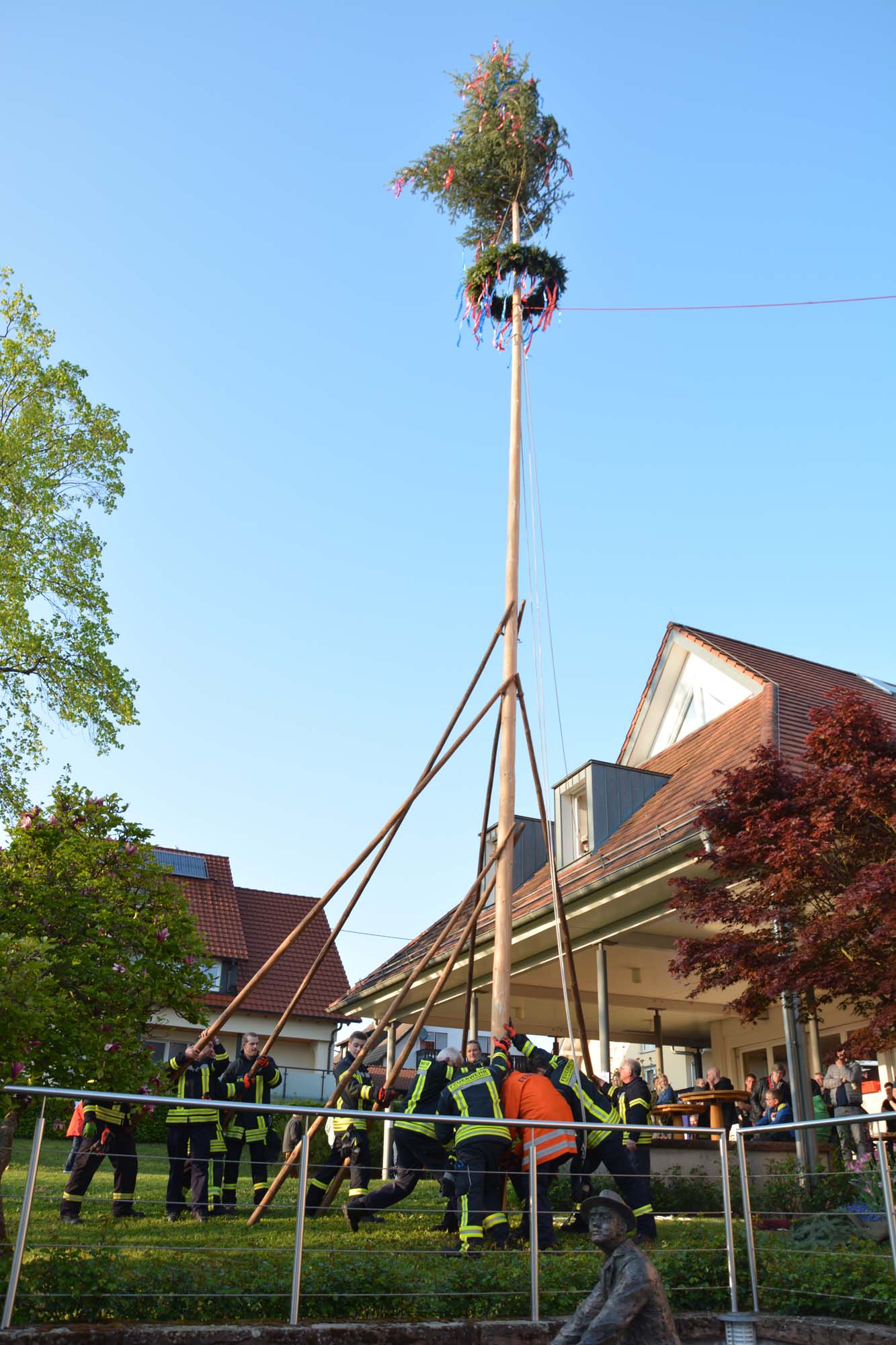 Da bekanntlich mit Musik alles besser geht, spielte die Unterentersbach Musikkapelle unter der Leitung von Dirigent Xaver Meier schwungvolle Melodien, während die Feuerwehrmänner unter der Regie von Abteilungskommandant Felix Schwendemann Stück für Stück mit Muskelkraft den bunt geschmückten Maibaum aufrichteten. Nach einer halben Stunde strebte der 18 Meter lange Maibaum dem blauen Himmel entgegen und die Musikkapelle ließ mit dem Badnerlied die Feuerwehrmänner hochleben.