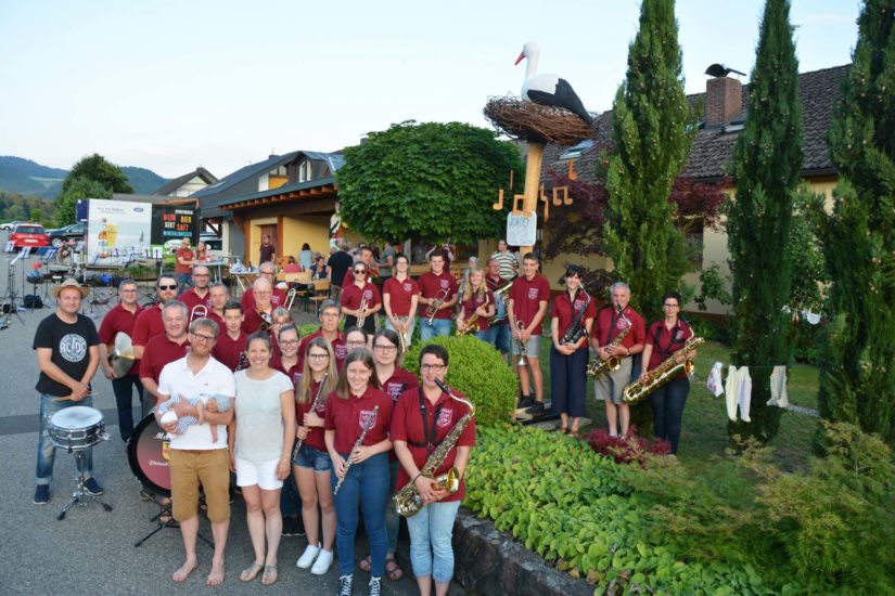 Zum Storchstellen mussten die Musikerinnen und Musiker nach Unterentersbach kommen, wo die junge Familie Obergföll vorübergehend Quartier bezogen hat. Nachdem der kunstvoll gestaltete Storch sein Nest in der Friedenstraße bezogen und die Namenstafel montiert war, gab die Kapelle unter der Leitung von Dirigent Stefan Griesbaum ein schwungvolles Platzkonzert.