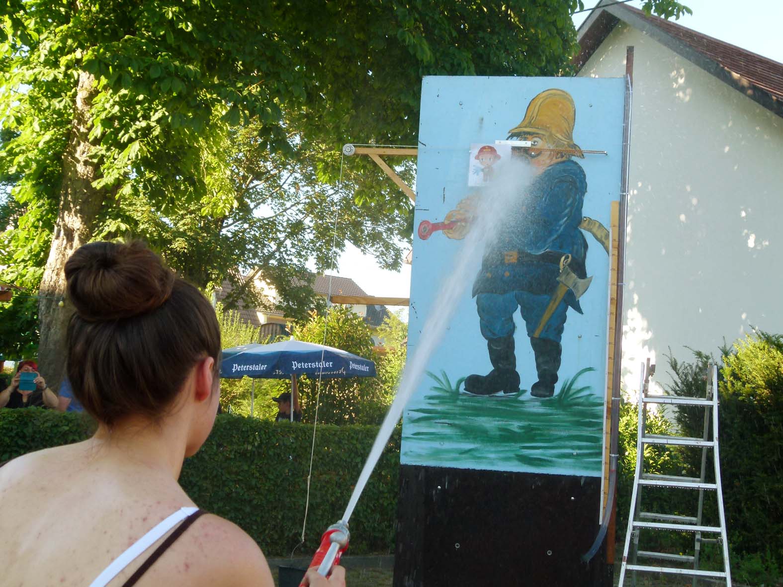 Foto: Reinhard BergerFür viel Spaß und vor allem auch für eine willkommene Abkühlung sorgte zum Auftakt am Samstagabend der Spritzerwettbewerb. Der stellv. Abteilungskommandant Xaver Schwendemann nahm die Auslosung vor. Trotz der hohen Temperaturen hatten sich fünf Mannschaften angemeldet. Zwei weitere, die Bläserjugend und der FC Hollywood, meldeten sich während des Wettkampfes noch an.
