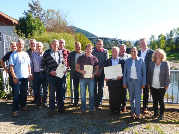 Aus Anlass der Schlussfeststellung überreichte Jäger die von Peter Hauk, Minister für Ländlichen Raum und Verbraucherschutz, unterzeichneten Dankesurkunden an die anwesenden Vorstandsmitglieder. Zum Vorstand der Teilnehmergemeinschaft gehören Georg Buchholz, Martin Schmieder, Josef Willmann, Wilhelm Gißler, Guido Lerch und Symphorian Schilli. »Sie waren diejenigen, die für die Interessen der Teilnehmer eingestanden sind, Sie haben das Verfahren wesentlich vorangebracht«, betonte Jäger. »Nicht vergessen wollen wir heute aber auch die bereits verstorbenen Initiatoren Ludwig Schüle, Franz Schwendemann, Erwin Willmann und Friedrich Moser«, so Jäger weiter. Der Vorsitzende Georg Buchholz bedankte sich bei allen Beteiligten und auch Michael Ortlieb hob die gute Zusammenarbeit von Privatbesitzern, Gemeinde und Landratsamt mit verschiedenen Fachabteilungen besonders hervor. »Die Herausforderung solche Verfahren positiv abzuschließen gelingt, wenn man gemeinsam nach Lösungen sucht«, so Ortlieb.