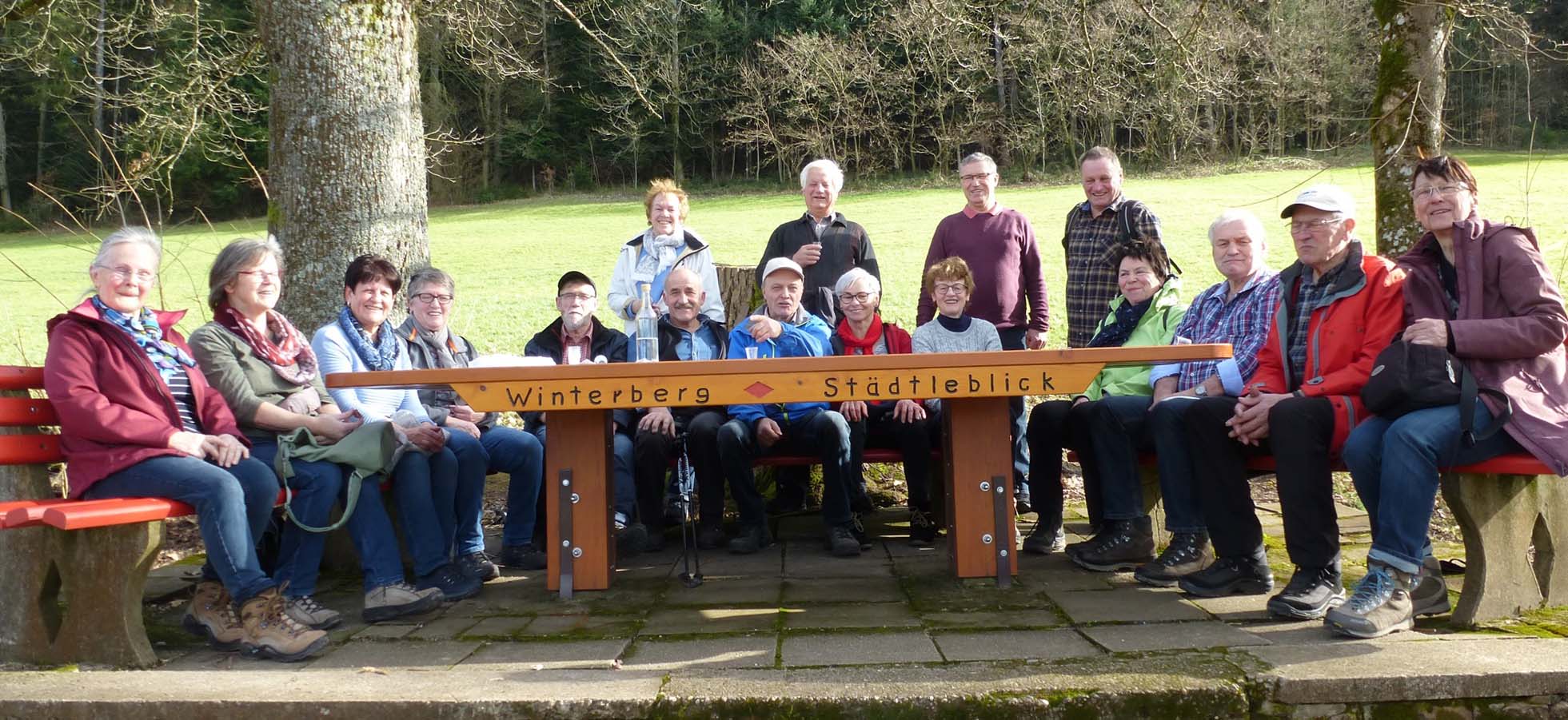Direkt vom Dorf aus ging es im Sonnenschein über den Oberen Hillig in den Alten Wald. Hier hatten die Stürme der vergangenen Tage wieder ordentlich gewütet, zwei Bäume waren direkt über den Wanderweg gefallen. Der Weiterweg führte am Winterberg zum »Städtleblick«, der seinem Namen alle Ehre machte. Der drohende Wetterumschwung bescherte einen besonders klaren Blick auf das Städtle und seine Umgebung. Die schöne Sitzgelegenheit nutzte die Wandergruppe zu einer Pause und zum Genuss einiger Leckereien aus dem Rucksack der Tourenführer. Bis zum Parkplatz am Wiesenwald folgte man dem Weg, bevor es wieder abwärts Richtung Bahnhof ging.