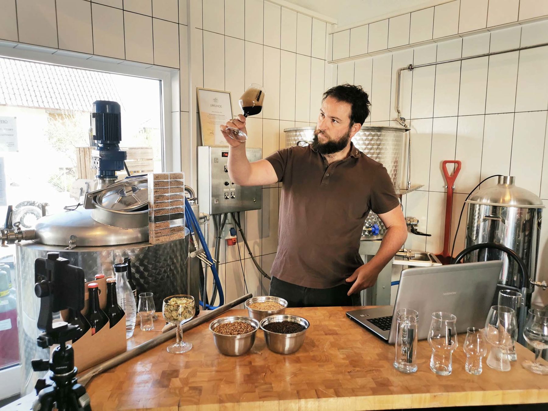 »Es ergibt sich trotz der Distanz eine gesellige Runde«, berichtet Andy Alst von den ersten Online-Abenden. Die Teilnehmer können sich via Webcam und Mikrofon zuschalten, Fragen stellen und sich aktiv am Geschehen beteiligen. Andy Alst selbst erzählt Hintergrundstorys, berichtet übers Bierbrauen, vermittelt Wissenswertes.