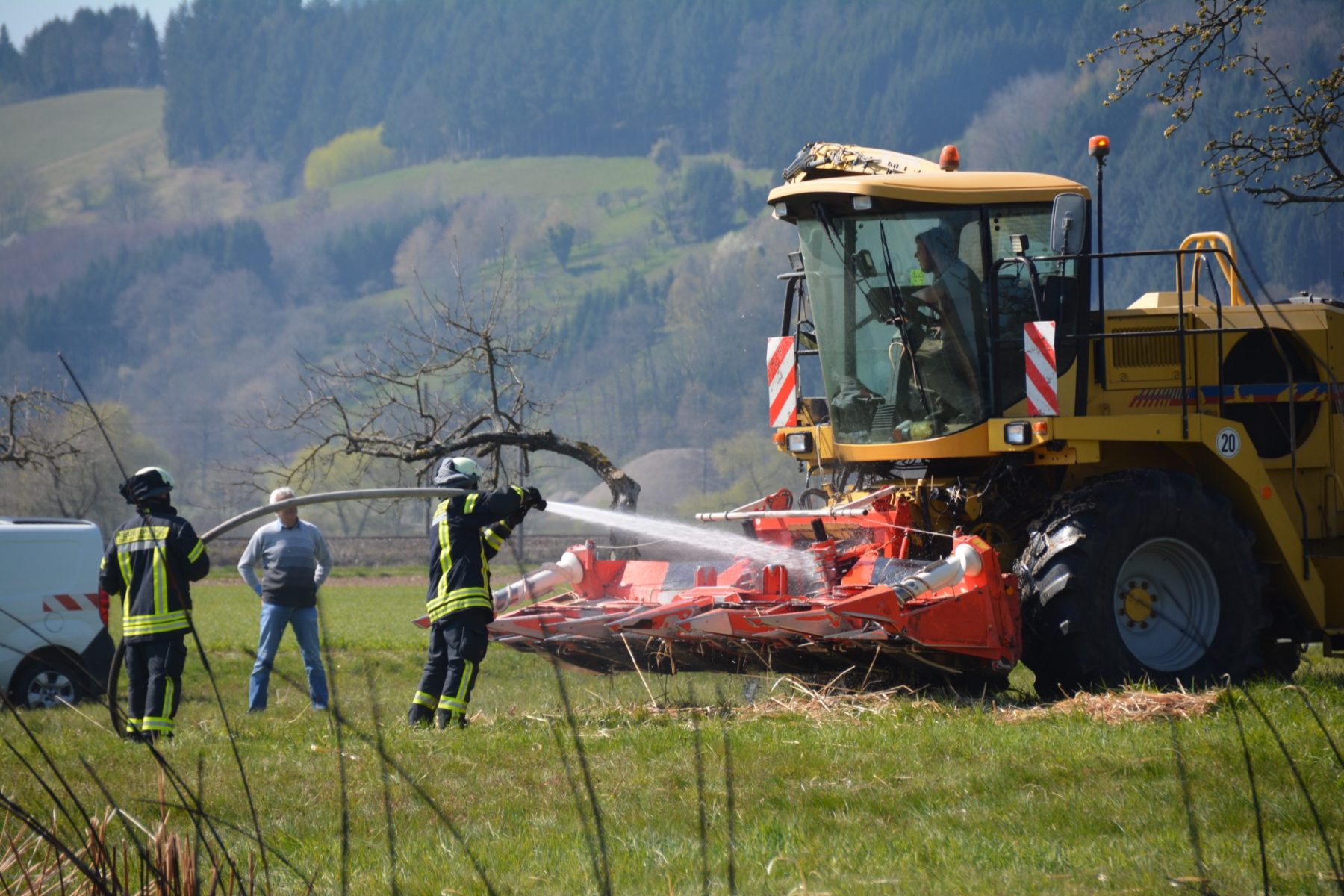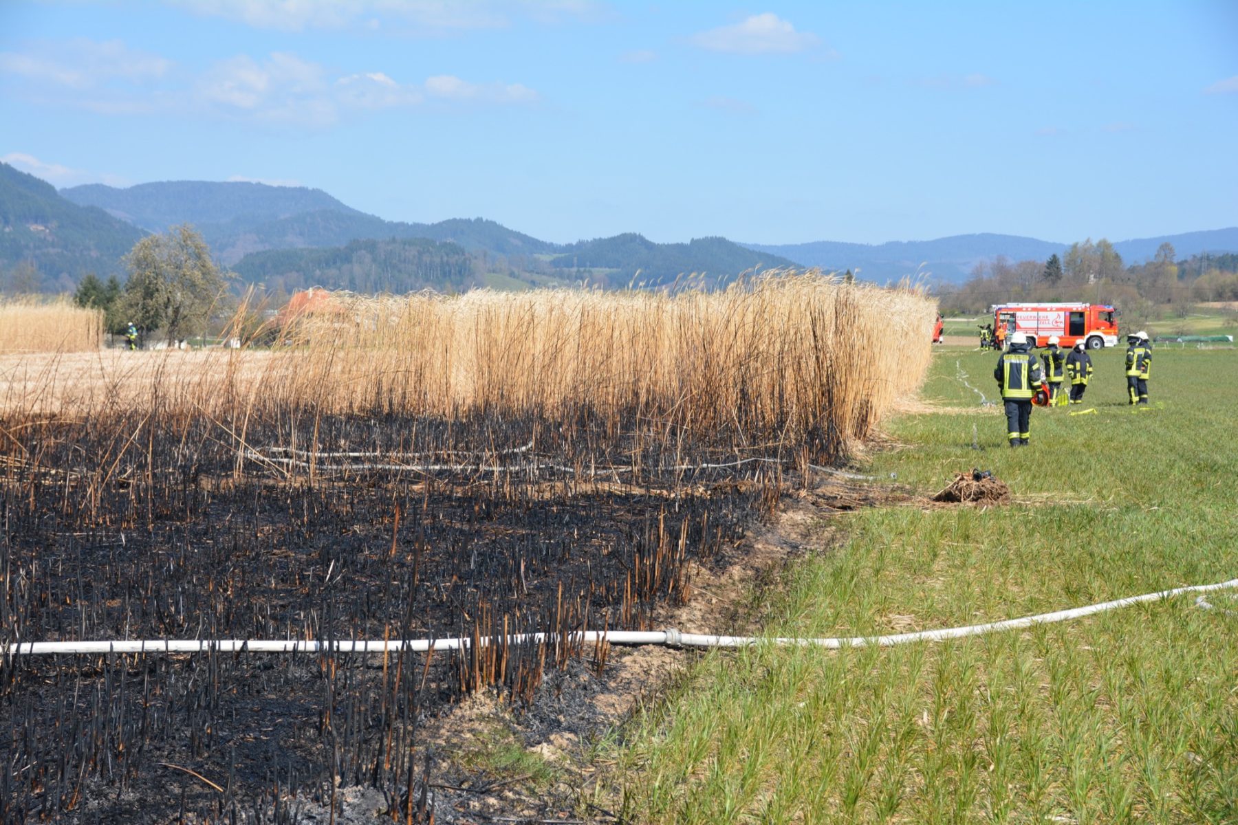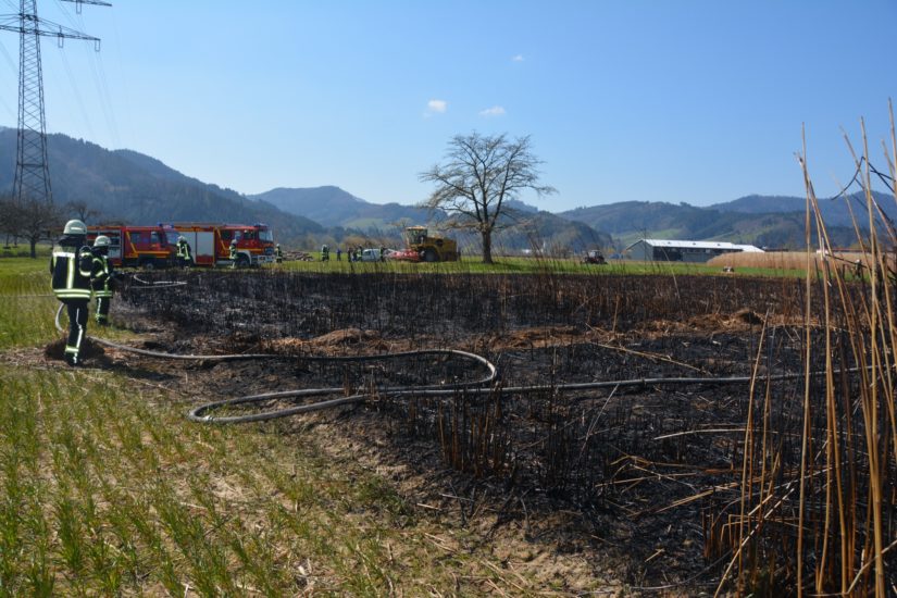 »Die Brandlast war enorm, als wir an die Unglücksstelle kamen«, berichtete Gesamtkommandant Philipp Schilli. Die Flammen schlugen meterhoch aus dem trockenen Chinaschilf. Hilfreich war, dass der Landwirt noch eine Schneise ziehen konnte, so dass nicht das ganze Feld in Brand geraten war. Durch den großen Einsatz von Löschwasser konnte der Brand auf der rund 300 Quadratmeter großen Fläche bald gelöscht werden.