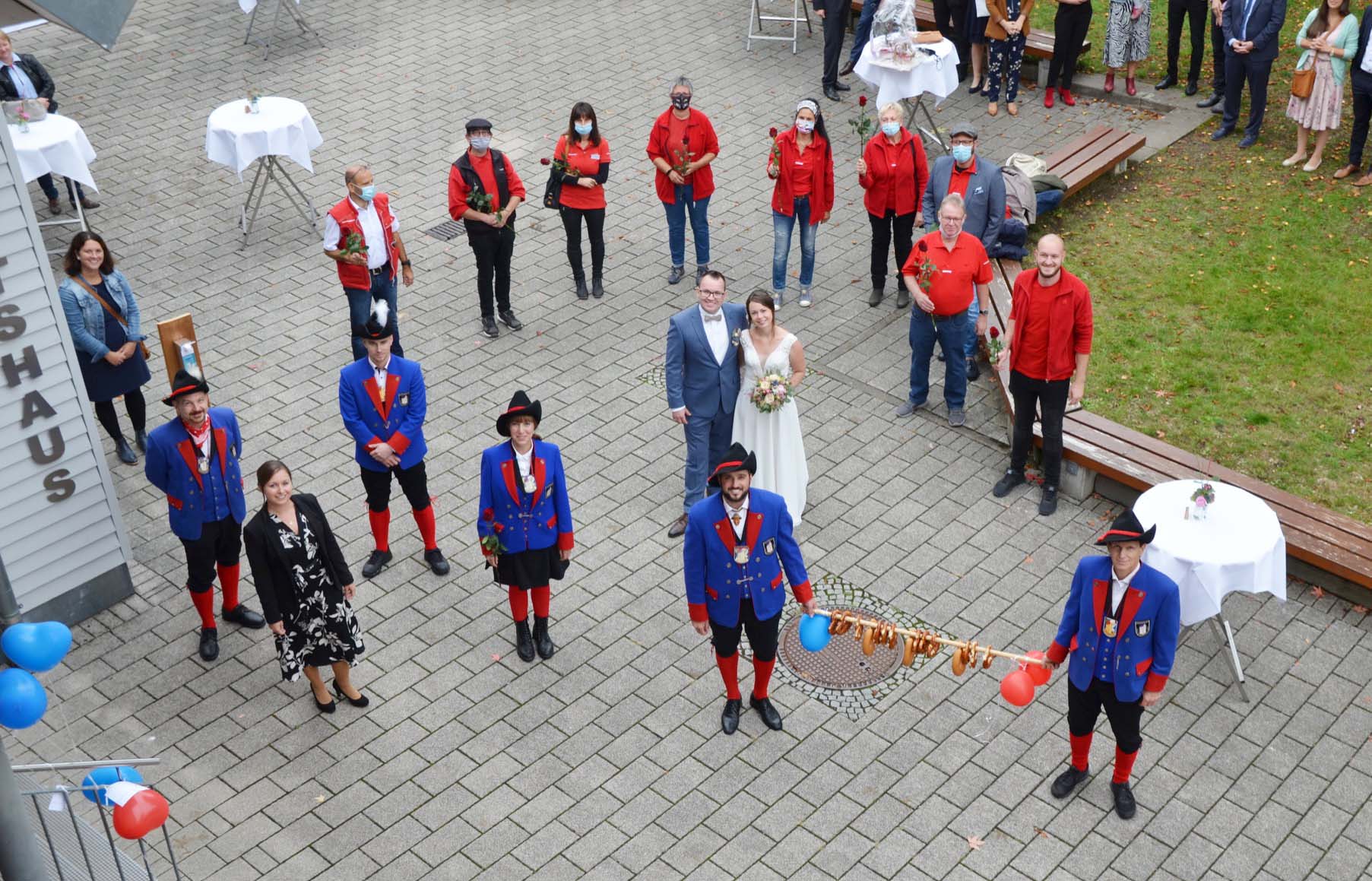 Im Hof des Dorfgemeinschaftshauses warteten derweil mit Abstand verschiedene Gratulanten. An erster Stelle die Entersbacher Narrengemeinschaft. Ihrem Präsidenten Martin Isenmann rief Rätin Jennifer Vollmer zu: »Du führst uns Narren an, weil du es am besten kannst!« Und gab ein Lob auf sein närrisches Talent zu hören. Dem Paar dankte sie für dessen Engagement in der Gemeinschaft und bei der Zeller Fasend: »Ihr zwei gehört zu uns Narre, wie d’ borschdig Sau zu d’ hoorig Katz, wie d’ Backe und d’ Schmatz.« Eine mit Wurst und Brezeln behangene Vesperstange gab es von den Narren als Wegzehrung sowie rote und blaue Luftballons, die die Narren mit besten Wünschen für das Paar in die Lüfte entließen.
