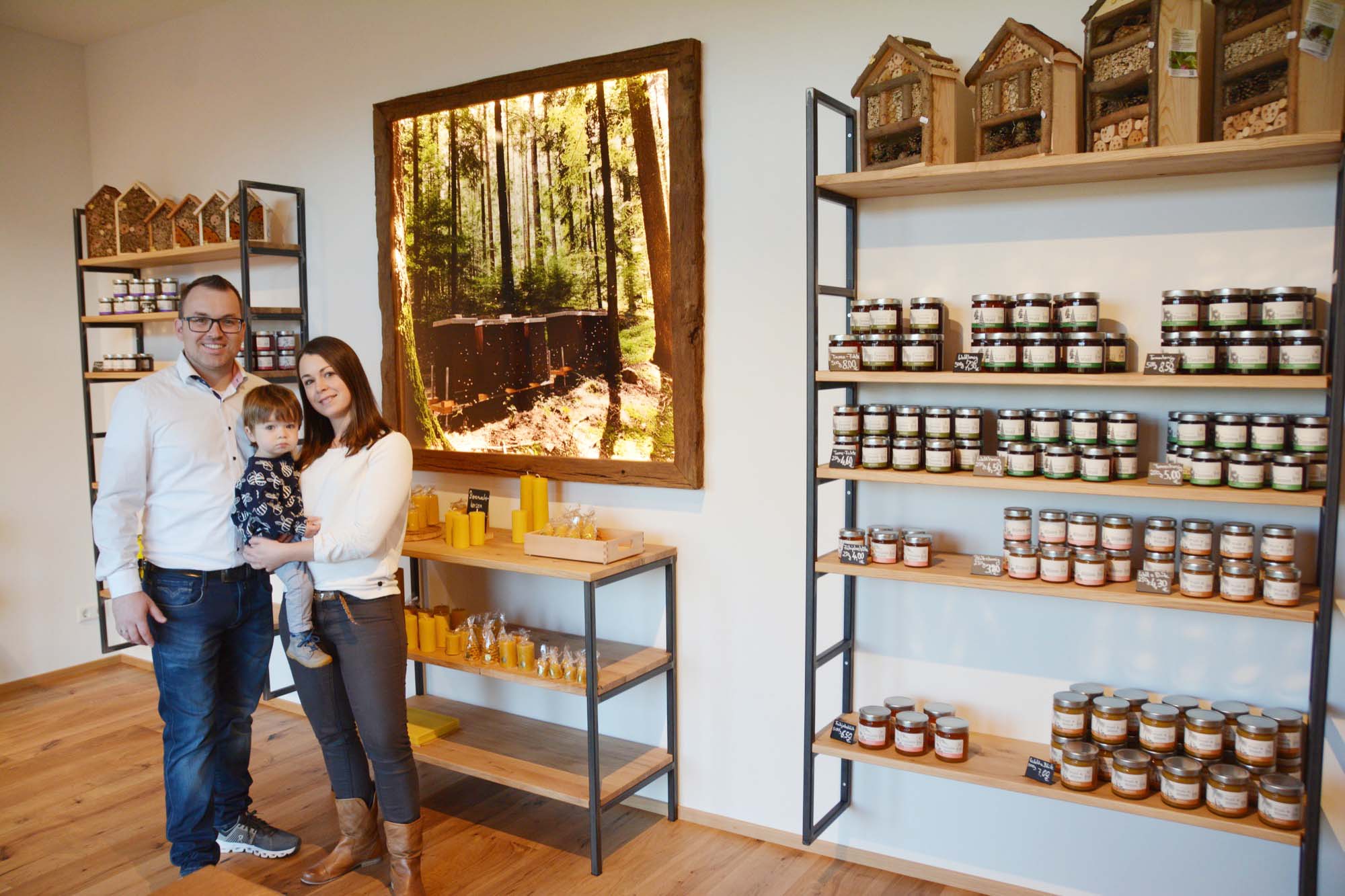 Ehefrau Monika Isenmann ist im Familienunternehmen beim Abfüllen des Honigs, der Herstellung der Honigkreationen und der Bienenwachs-Kerzen im Einsatz. Und ab sofort ist sie für den Verkauf im neuen Honigladen zuständig. Auch Sohn Ben ist zumindest in seinem Pulli mit Bienenmotiven schon ein kleiner Imker.