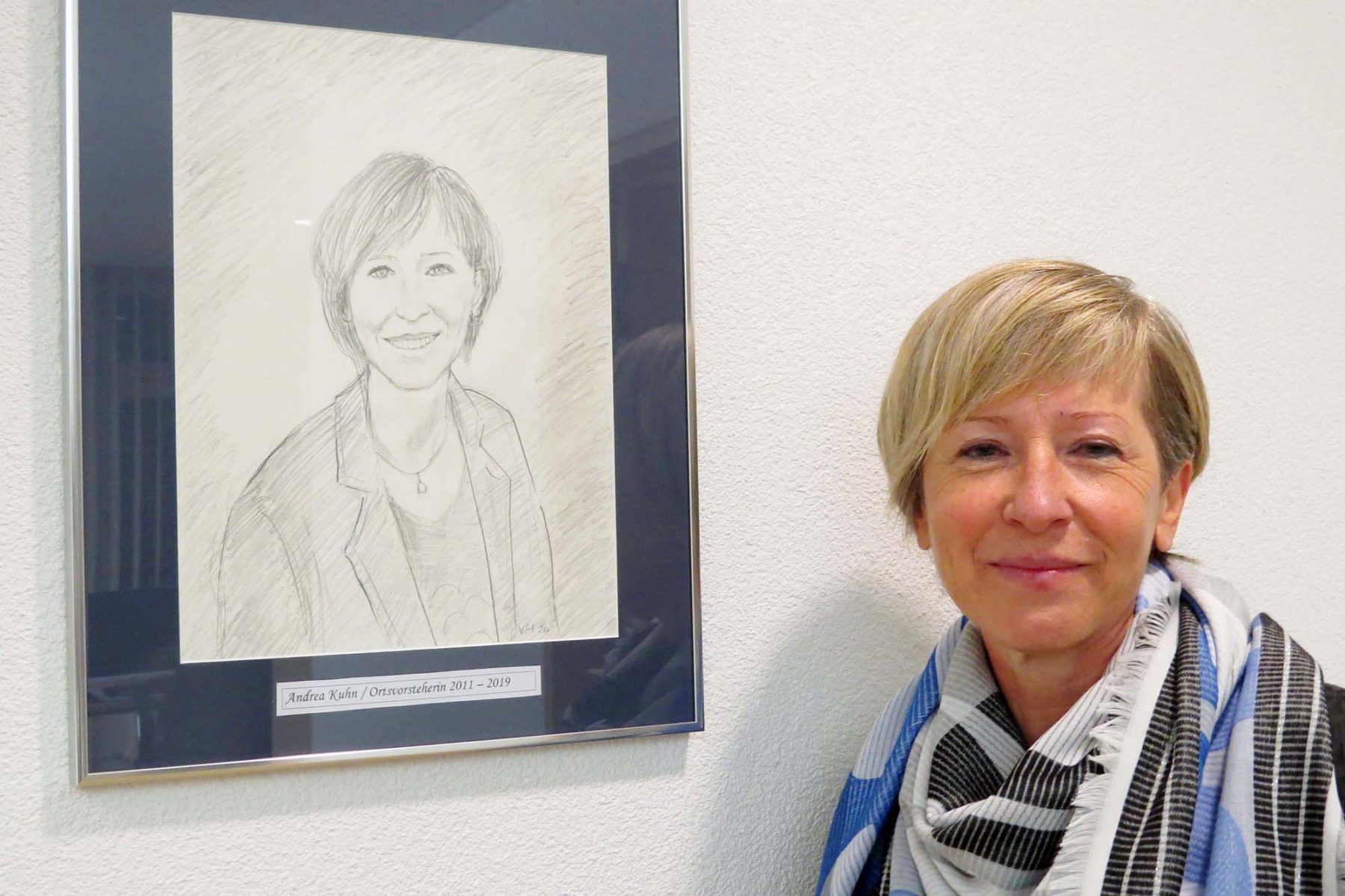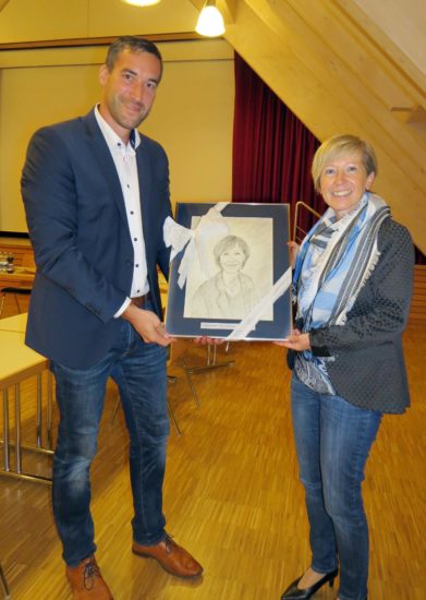 Am Ende der Ortschaftsrats Sitzung am Mittwochabend im Dorfgemeinschaftshaus gab es eine Überraschung: Das Portrait von Andrea Kuhn für die »Ahnengalerie« ist fertig, wurde ihr überreicht und anschließend gleich aufgehängt. Danach gab es einen kleinen Umtrunk, zu dem auch die Ortschaftsräte aus ihrer Amtszeit eingeladen waren.