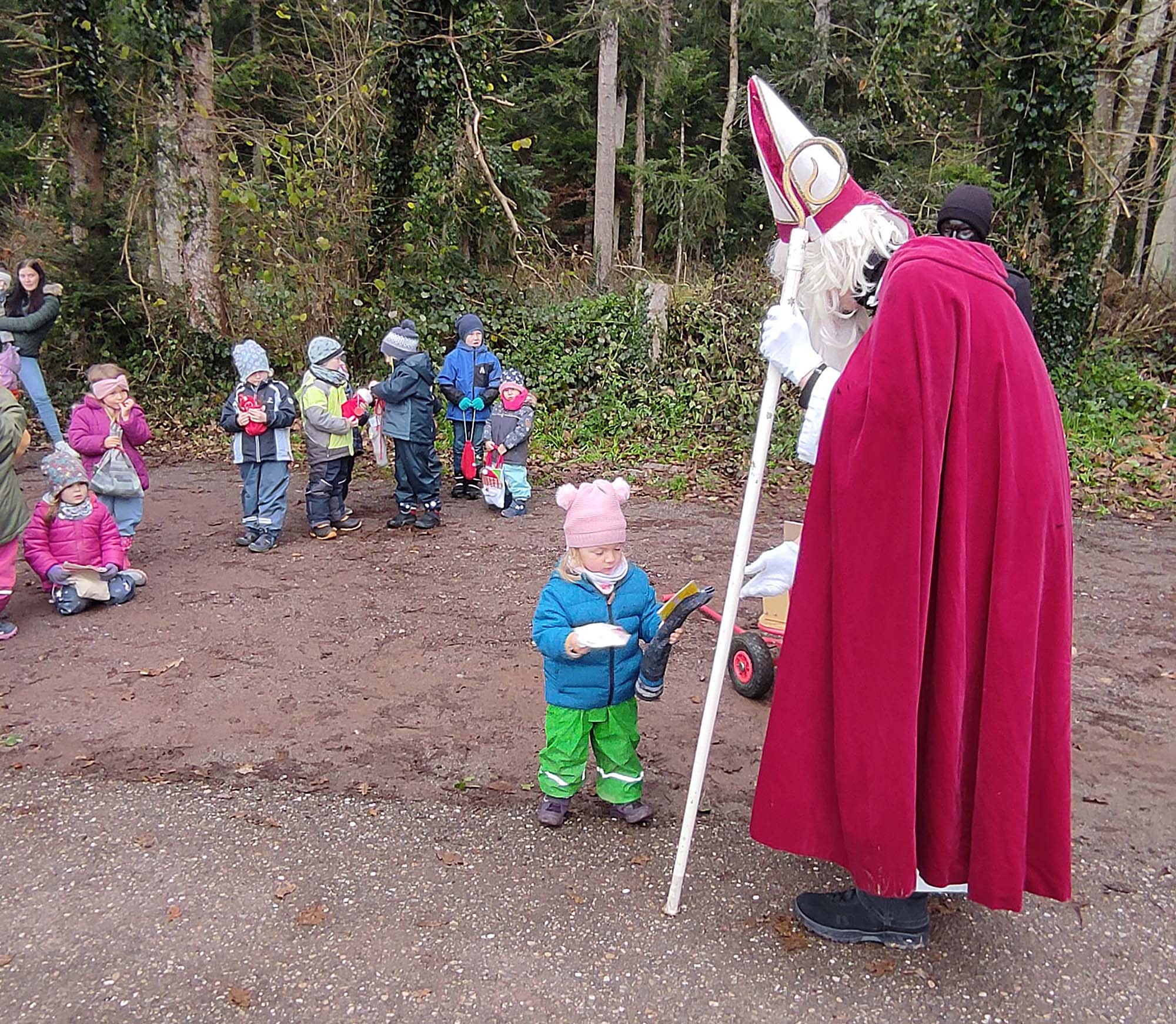 Die Kinder des Kindergartens »Wirbelwind« wurden bei einem Spaziergang beim »Alten Wald« vom heiligen St. Nikolaus und einem seiner Gesellen freundlich überrascht. Nach Lob und Tadel erhielt jedes Kind ein Geschenk. Auch an die Erzieherinnen hat der Nikolaus gedacht.