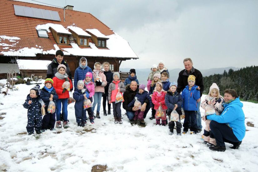 Der Weiterweg über den Bergrücken mit noch etwas tieferem Schnee brachte manchen Kinderwagenschieber ins Schwitzen, bis die Runde beim Oberen Steinhof wieder geschlossen war und man flott dem Schmalzenhof entgegenwanderte. Hier hatte Gertrud Lerch dem Osterhasen schon beim Verstecken geholfen, sodass die Kinder gleich zum Hasjagen ausschwärmen konnten. Bald kamen sie stolz mit gefüllten Beuteln zurück und stellten sich unter Regie von Franz Huber zum Gruppenfoto auf.