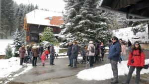 In einer langen Autokolonne steuerte man die Breitebene bei Hofstetten an und erlebte gleich eine winterliche Überraschung. War zu Hause vom Schnee des Vortags nicht mehr viel zu sehen, so erwartete die Wanderschar beim Schmalzenhof eine tief verschneite Winterlandschaft. Während die Kinderwagen mit den Kleinsten startklar gemacht wurden, flogen bei den größeren Kindern schon die ersten Schneebälle.