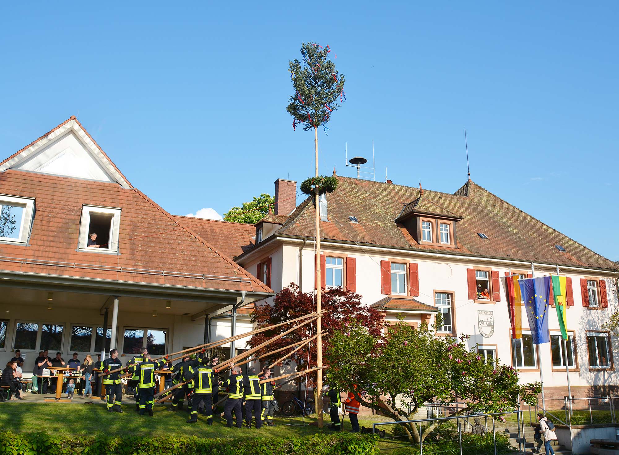dann am 30. April den Maien zum Platz beim Dorfgemeinschaftshaus. Mit Muskelkraft, Übersicht und Vorsicht wurde der Maibaum Stück für Stück aufgerichtet. Nach einer halben Stunde war das Werk vollbracht und die Feuerwehrmänner wurden mit viel Applaus belohnt.