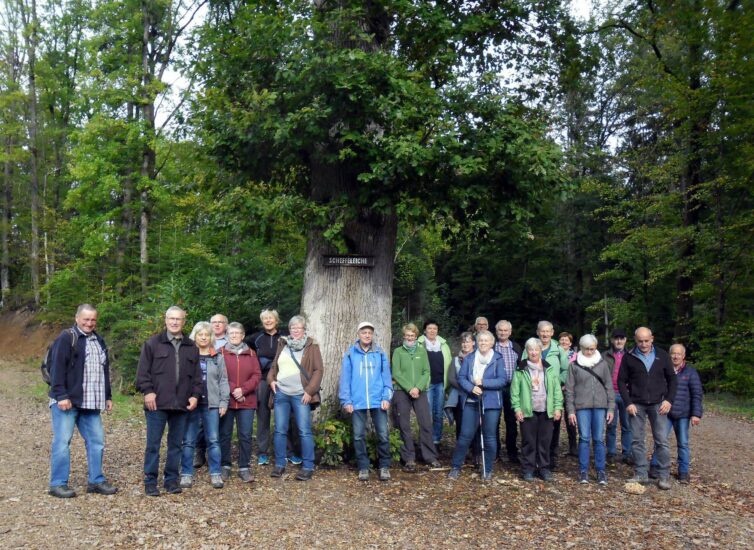 Ein bequemer Waldweg führte hinauf zur Scheffel-Eiche, ein Naturdenkmal, dem Gengenbacher Dichter Josef Victor von Scheffel gewidmet. Nach kurzer Pause und Gruppenbild wanderte man wieder leicht abwärts und bog beim Steingräble Richtung Forstschule Mattenhof ab, wobei man sich auch eine kurze Wegstrecke auf dem Philosophenweg mit seinen wechselnden Kunstwerken befand.