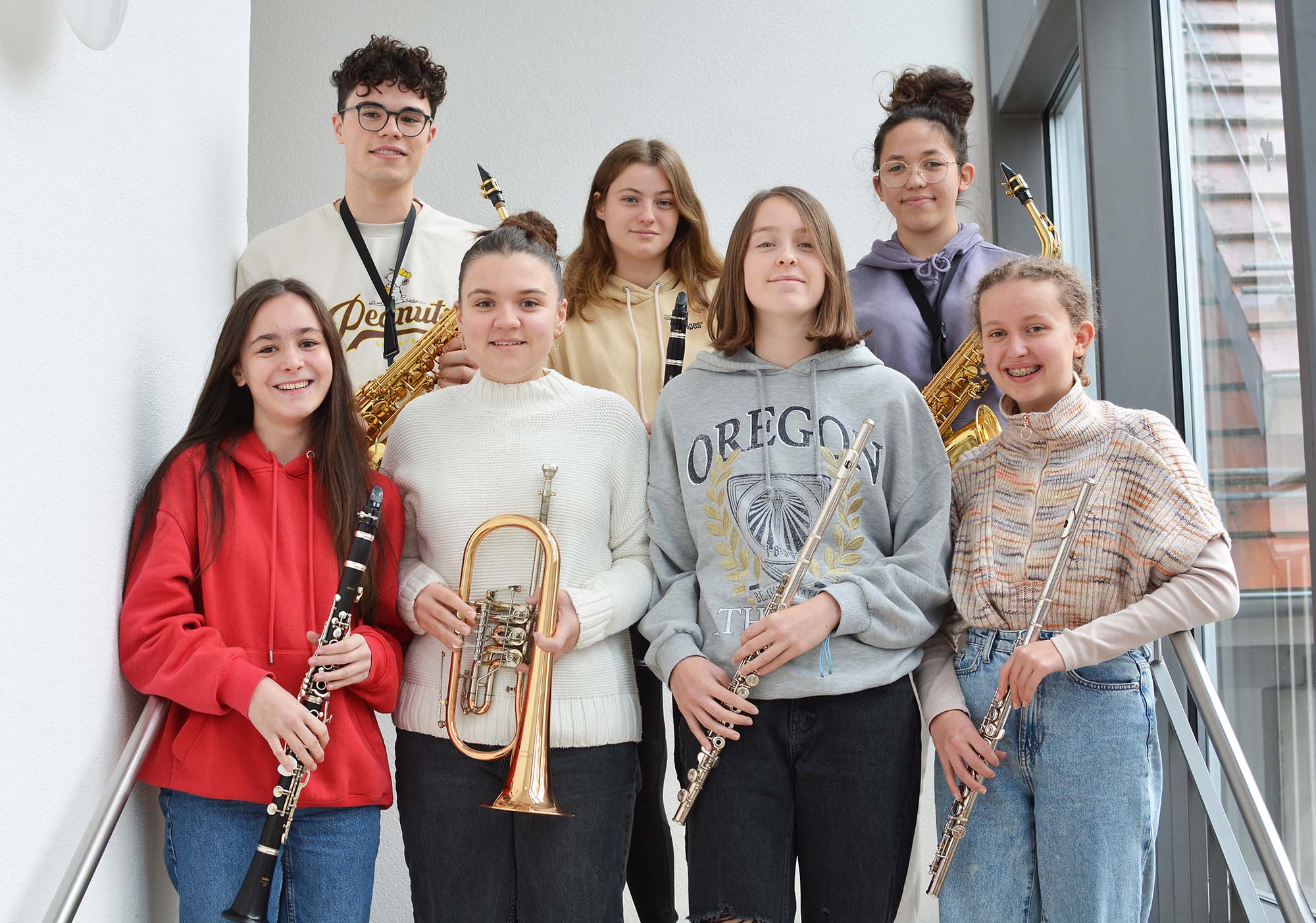 Die Musikerinnen und Musiker haben sich intensiv auf den Konzertabend vorbereitet und viele Gesamt- und Satzproben absolviert. Am Samstag, den 3. Dezember um 20 Uhr, ist es soweit. Sie können sich endlich auf der Bühne des Dorfgemeinschaftshauses präsentieren. Zum ersten Mal beim Nikolauskonzert dabei sind (hinten von links nach rechts) Adrian Willmann, Franziska Schätzle, Emelie Knäble; (vorne von links nach rechts) Lena Pfaff, Marie-Luise Bruder, Larissa Baumann, Emma Schwarz. Es fehlen: Lena Kalt und Sarah Brucher.