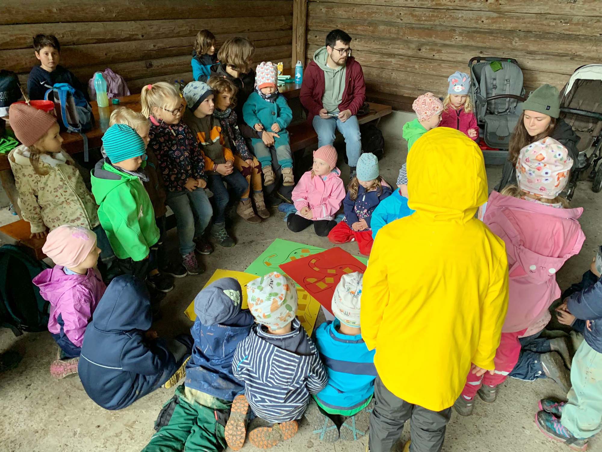 Die kleinen Elefanten führten auf unterschiedlichen Wegen zur Herrenholz-Hütte. Oben angekommen wurden mit den gesammelten, bunten Herbstutensilien, große einfarbige Elefanten in großartige, bunte Elefanten umgestaltet.