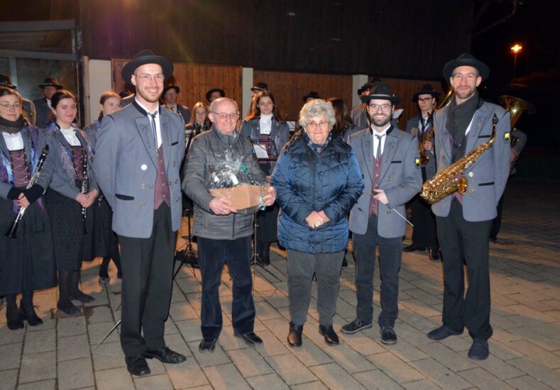 Die Glückwünsche der Dorfgemeinschaft überbrachte Ortsvorsteher Christian Dumin den beiden Geburtstagskindern. Am Mittwochabend erklang dann Blasmusik im Dorf. Zuerst marschierten die Musikerinnen und Musiker in die Gaß zu August Damm, danach zu Josef Zeferer in den Helmen.