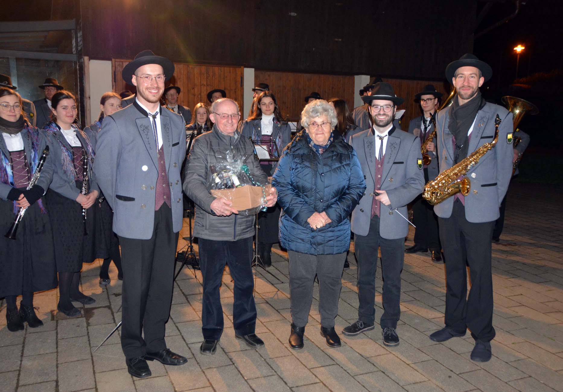 Unter der Leitung von Dirigent Daniel Faißt erfreute die Musikkapelle die Geburtstagskinder mit schwungvollen Melodien und auch das Badner-Lied durfte dabei nicht fehlen. Die beiden Vereinsvorstände Florian Berger (Fachbereich Öffentlichkeitsarbeit) und Moritz Volk (Fachbereich Musik) würdigten das langjährige Engagement, mit dem sie den Musikverein unterstützt haben. Zum Musikgenuss fürs Gemüt überreichten sie obendrein einen Geschenkkorb.