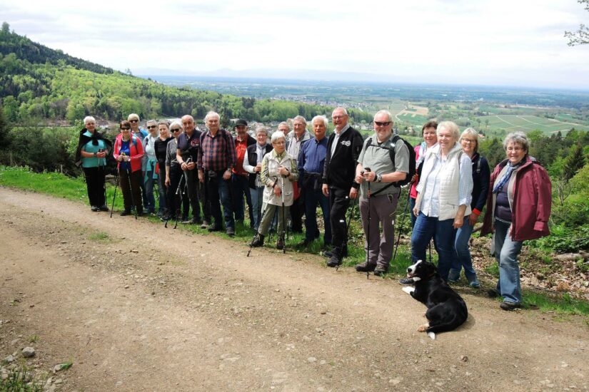 Über breite und schmale Waldwege erreichte man die »Schopfheimer Hütte« inmitten eines schönen Rastplatzes. Nach einer Pause, versüßt durch ein Likörle von den Tourenführern, führte der Weg bergab, heraus aus dem Waldgebiet zu einem herrlichen Aussichtspunkt über die ganze Rheinebene bis zu den Vogesen.